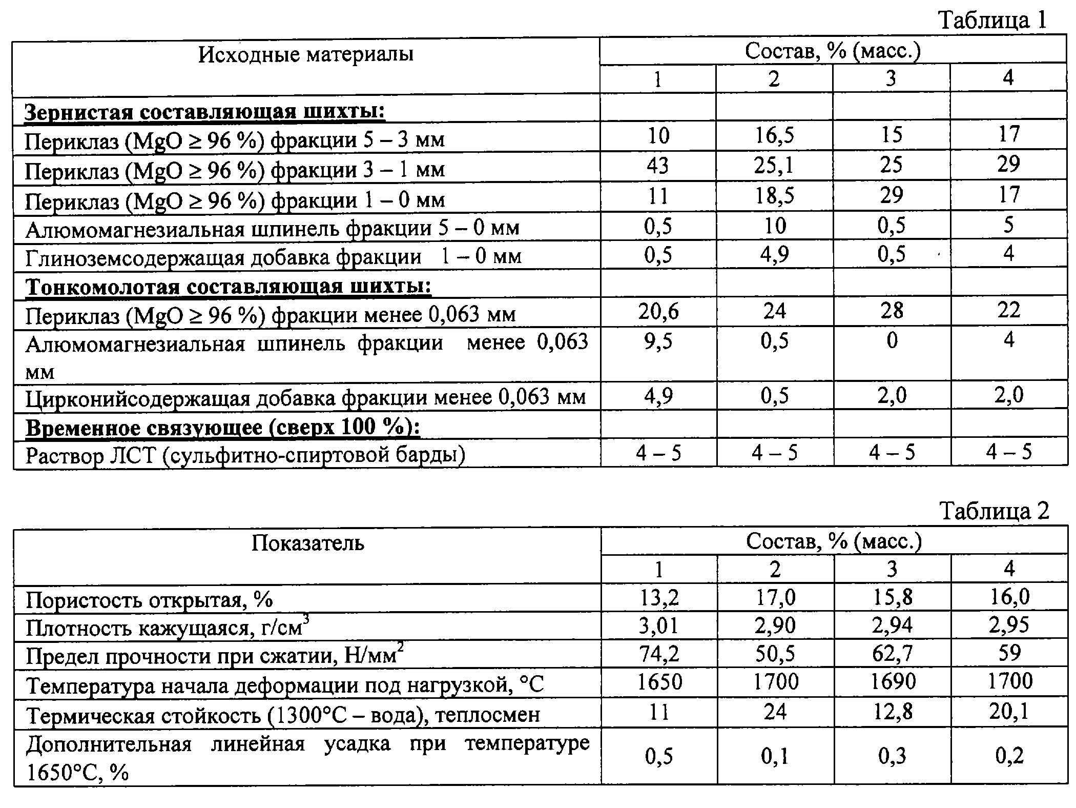Изобретение относится к огнеупорной промышленности и может быть использовано для изготовления периклазошпинельных огнеупорных изделий, предназначенных для футеровки вращающихся и шахтных печей и других высокотемпературных агрегатов. Периклазошпинельные огнеупорные изделия получены из массы, включающей зернистую и дисперсную составляющую, содержащую зернистые периклаз, алюмомагнезиальную шпинель, глиноземсодержащую добавку и дисперсную составляющую, содержащую дисперсный периклаз и цирконийсодержащую добавку, где глиноземсодержащая добавка представлена зернистым пластинчатым корундом фракции 1-0 мм, дисперсная составляющая фракции менее 63 мкм представлена продуктом совместного помола периклаза и цирконийсодержащей добавки в виде дисперсного бадделеита или технического диоксида циркония при следующем соотношении компонентов, мас.%: зернистый периклаз фракции 5-3 мм – 15,0-26,0; фракции 3-1 мм – 25,0-67,0; фракции 1-0 мм – 17,0-29,0; зернистая алюмомагнезиальная шпинель фракции 5-0 мм – 0,5-10,0; глиноземсодержащая добавка фракции 1-0 мм – 0,5-5,0; дисперсный периклаз фракции менее 63 мкм – 21,4-34,3; дисперсная цирконийсодержащая добавка фракции менее 63 мкм – 0,5-5,0. При этом для изготовления огнеупорной массы используют смесь, содержащую зернистую составляющую фракции 5-0 мм и тонкомолотую составляющую фракции менее 0,063 мм в соотношении по массе (1,86-3,00):1. Предлагаемые периклазошпинельные огнеупорные изделия имеют высокую прочность, более низкую пористость в высокотемпературной окислительной печной среде, что улучшает их эксплуатационные и ресурсные характеристики в службе. 2 н. и 2 з.п.ф-лы, 2 табл. Изобретение относится к огнеупорной промышленности и может быть использовано для изготовления периклазошпинельных огнеупорных изделий, предназначенных для футеровки вращающихся цементных печей, вращающихся и шахтных печей для обжига извести и других высокотемпературных агрегатов. Известен периклазошпинельный огнеупор, описанный в заявке №97101941/03 Россия, для изготовления которого используется шихта, включающая зернистый и дисперсный периклазовые порошки и зернистую алюмомагниевую шпинель. При этом шихта дополнительно содержит дисперсную алюмомагниевую шпинель и хромпикотит при следующем соотношении компонентов, мас.%: зернистый и дисперсный периклазовые порошки 75-92, зернистая и дисперсная алюмомагниевая шпинель 7-20, хромпикотит 1-5, при этом соотношение зернистого и дисперсного периклазовых порошков составляет 1,29-2,19, соотношение зернистой и дисперсной алюмомагниевой шпинели составляет 0,45-4,0, а отношение Сr2О3/Аl2О3 в массе составляет 0,04-0,40 при отношении MgO/R2O3 4-11. Однако данный периклазошпинельный огнеупор обладает рядом недостатков. Первый – это снижение прочности при высоких температурах из-за высокого содержания относительно легкоплавких примесей и добавок. Второй – низкая устойчивость к переменам окислительной атмосферы печи на восстановительную и, наоборот, из-за высокого содержания оксидов железа в хромпикотите и экологическая опасность его применения из-за возможности образования шестивалентного хрома. Известен способ изготовления периклазошпинельных огнеупорных изделий, описанный в заявке №97102612/02 Россия, включающий приготовление алюмомагнезиальной композиции путем совместного помола периклаза и глинозема, окус
