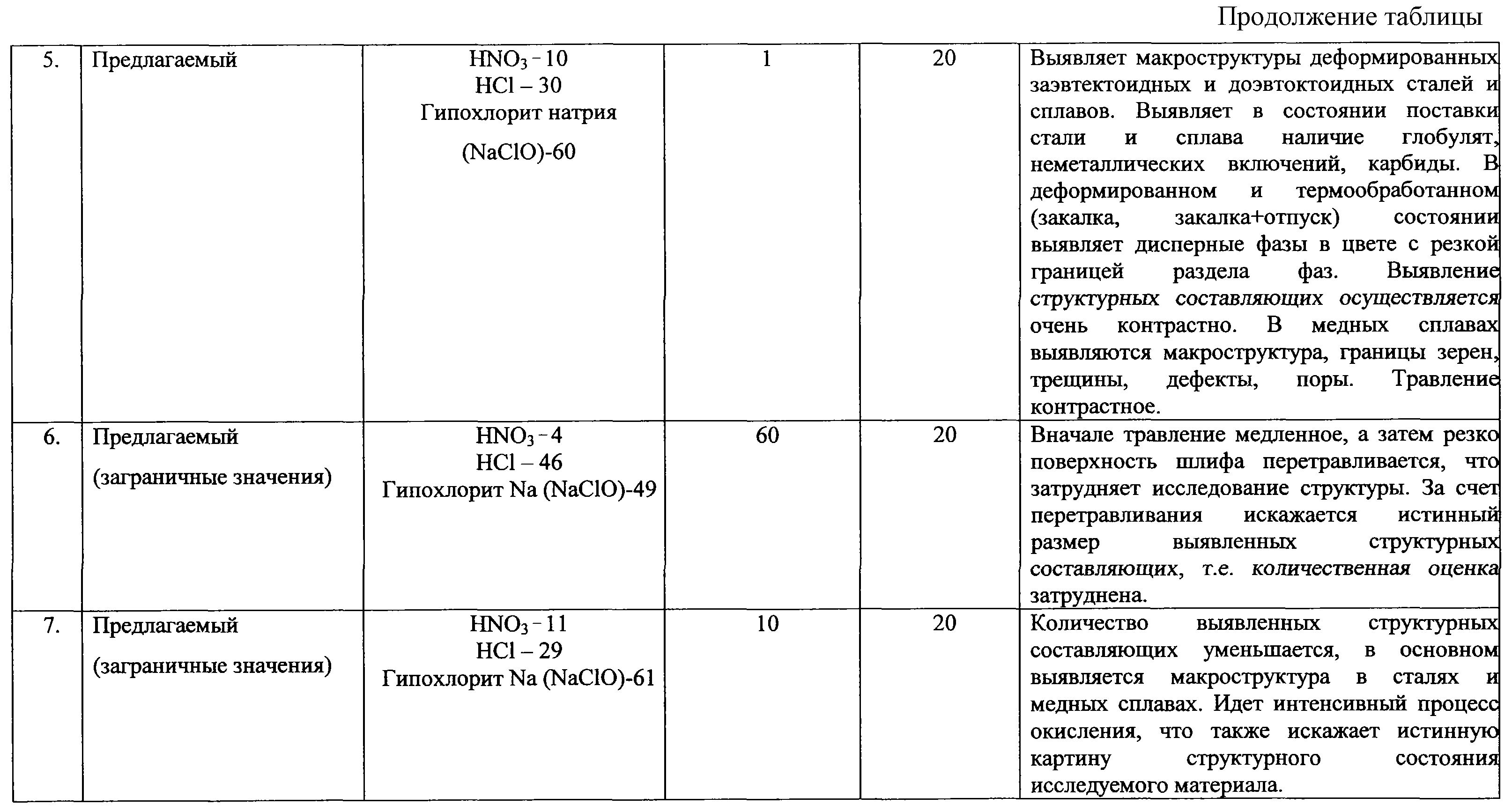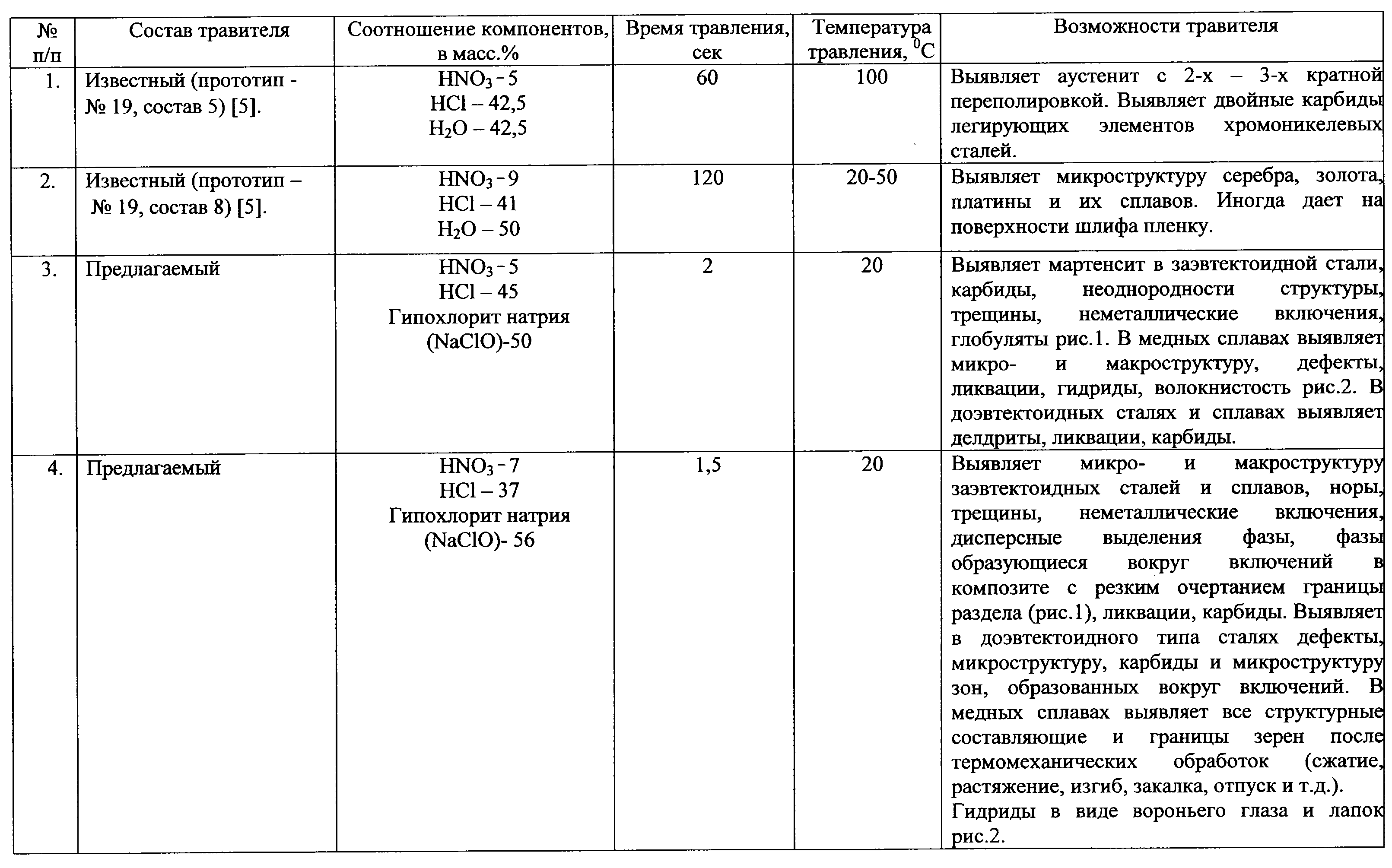 Изобретение относится к технике исследования поверхности металлов и сплавов, в частности к исследованию структурного составления сталей и цветных сплавов на основе меди. Оно может быть использовано для контроля углеродистых, низколегированных сталей и сплавов и медных сплавов. Оно может быть использовано как универсальный травитель, выявляющий одновременно как микро- и макроструктуру исследуемого материала, так и дефекты структуры, включения, примеси, дисперсные фазы оксидов, карбидов, ликвации, границы зерен. Оно может быть использовано для послойного травления и, в случае необходимости, мгновенного выявления структуры деформируемого образца (волочение, растяжение, изгиб, сжатие и т.д.). Уровень техники. Известны наиболее распространенные травители для выявления макроструктуры [1]. Для углеродистых и легированных сталей предлагают травитель, содержащий 50 мл НСl (уд.в., т.е. Известен травитель [2] для выявления макроструктуры сталей высокопрочных мартенситностареющих типа ООН18К9М5Т. Он содержит соляную кислоту 53-56%, азотную кислоту – 8-10%, воды – остальное, хромпик 50-60 (г/л). Недостатками известных травителей являются длительность процесса выявления (при 60-70 Для выявления микроструктуры углеродистых и низколегированных сталей наиболее известен 1-5% раствор НNО3 (азотной кислоты ( Недостатками известных травителей [3], [4], является их ограниченность: составы выявляют только микроструктуру и выявляют или сталь [4], или медь [3]. Выявление микроструктуры [3] требует значительной траты времени – 120 мин. И используется только для термообработанных сталей. Наиболее близким по технической сущности и положительному эффекту к предлагаемой задаче изобретения является состав [5] травителя, содержащий следующие компоненты, в мас.%: HNO3 ( Недостатками травителя, содержащего азотную и соляную кислоты, являются: – ограниченная возможность контроля, т.е. он выявляет границы зерен в термообработанных сталях, не является травителем медных сплавов, он травитель длительного воздействия (границы зерен стали выявляют за 10 мин и с попеременной переполировкой шлифа. Для травления хромистых и хромоникелевых сплавов требуется 4-5 часов. При соотношении компонентов, в мас.%: HNO3 – 9, НСl – 41, Н2O – 50 – выявляет только микроструктуру цветных металлов (золото, серебро, платина). Сущность изобретения. Задачей изобретения является ускорение процесса травления и расширение возможности травителя. Задача изобретения достигается тем, что травитель, содержащий азотную и соляную кислоты, согласно изобретению дополнительно содержит гипохлорит натрия при следующем соотношении компонентов, в мас.%: Азотная кислота ( Соляная кислота ( Гипохлорит натрия (NaClO) 50-60 Причинно-следственная связь. Сравнивая заявляемое изобретение с прототипом очевидно, что заявляемый травитель отличается от известного введением нового компонента, а именно гипохлорита натрия. Введение нового компонента – гидрохлорита натрия – обеспечило способность известного травителя значительно ускорить травление (от 3 мин до 80 мин – в прототипе и от 1 с до 2 с – в заявляемом, в зависимости от стали или сплавов на основе меди, их структурного состояния и напряженно-деформированного состояния). Предлагаемый травитель способен выявлять одновременно путем химического травления при комнатной температуре 