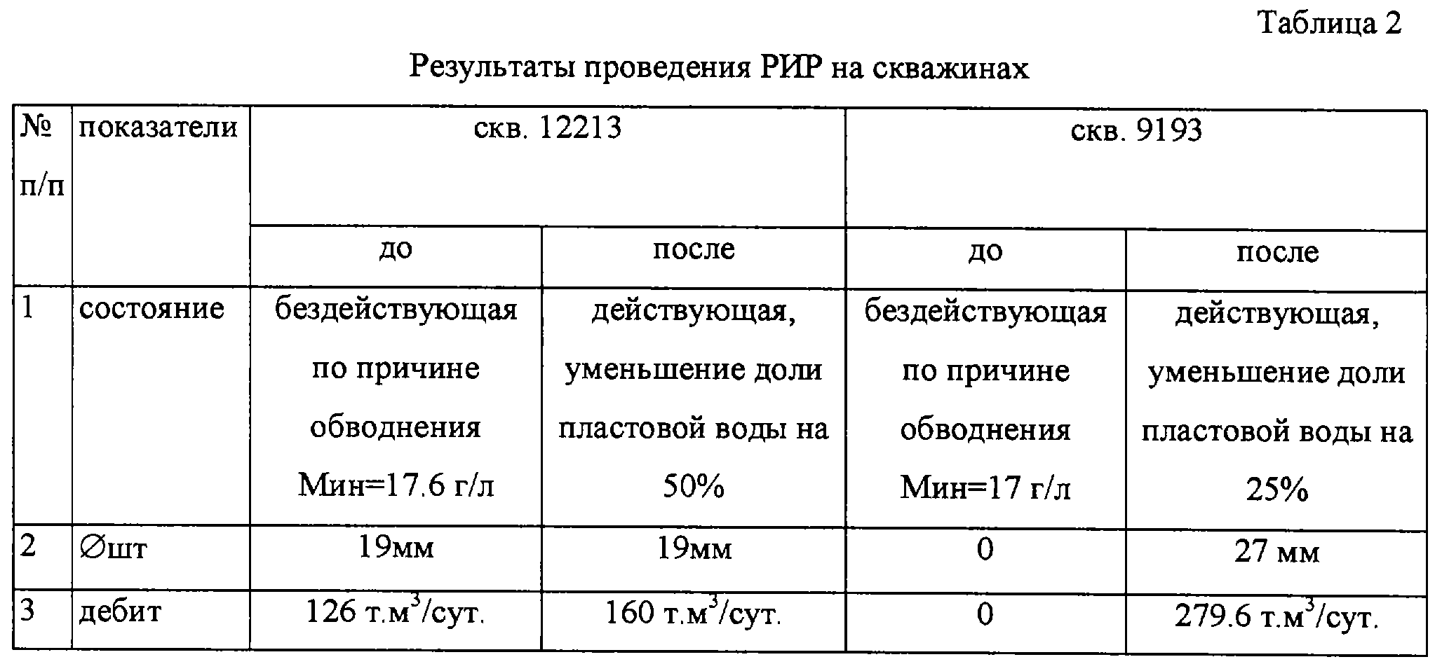 Изобретение относится к газодобывающей промышленности, в частности к изоляции водопритоков в газовых и газоконденсатных скважинах, особенно к селективной. Технический результат – повышение эффективности изоляции путем создания в водопроявляющих участках пласта устойчивого объемного осадка, препятствующего прорыву пластовых вод. В способе селективной обработки пласта, включающем последовательную закачку в пласт буферной жидкости – водного раствора соли металла и тампонирующего состава с образованием в пластовых условиях с ионами кальция нерастворимого в воде соединения – щелочного осадка, используют в качестве водного раствора соли металла 10-30% водный раствор гидросульфата натрия, а в качестве тампонирующего состава – водный раствор хлористого кальция, закачку каждого из указанных растворов производят равными порциями, объемы которых определяют исходя из толщины продуктивного пласта и диаметра скважины или скорости поглощения закачиваемых растворов. В пласте с проницаемостью 100 мкм2 указанный осадок закрепляют цементным мостом. Закачку растворов в пласт производят как в остановленной скважине, так и в работающей скважине. Для доставки растворов в заданную зону перфорации скважины и обеспечения расчетной скорости закачки используют кол-тюбинг. 3 з.п. ф-лы, 2 табл. Изобретение относится к газодобывающей промышленности, в частности к селективной изоляции водопритоков в газовых и газоконденсатных скважинах. Известен способ изоляции водопритоков в газовых скважинах, включающий закачку через насосно-компрессорные трубы цементного раствора при сохранении в затрубном пространстве скважины уровня жидкости на определенной глубине (SU 1758219 А2, Е 21 В 43/32, 1992). Сложность в осуществлении непрерывного контроля за уровнем жидкости в затрубном пространстве скважины и отсутствие контроля за процессом закачки цементного раствора при наличии в скважине пакера ограничивают применение указанного способа на многих газовых и газоконденсатных месторождениях. Известен также тампонажный состав для изоляции проницаемых пластов, содержащий полимер, ацетон и неионогенное поверхностно-активное вещество (ПАВ), так называемый А-пласт, применяемый на газовых скважинах (см. пат. РФ 2046180, Е 21 В 33/138, 1995). Однако и этот способ имеет ряд недостатков, заключающихся в технологической сложности и требующих применения специальных технических средств для обеспечения избирательности при обработке водопроявляющих участков пласта, и в большинстве случаев для закрепления эффекта устанавливают цементные мосты. Из известных способов ближайшим к изобретению является способ селективной обработки пласта в скважине, включающий последовательную закачку в пласт буферной жидкости – соли щелочного металла и тампонирующего состава, с образованием в пластовых условиях с ионами кальция нерастворимого в воде соединения – щелочного осадка (SU 1754889 А1, опубл. 15.08.1992). Задачей предлагаемого изобретения является повышение эффективности изоляции путем создания в водопроявляющих участках пласта устойчивого объемного осадка, препятствующего прорыву пластовых вод, и подключение за счет этого в разработку застойных и слабодренируемых зон пласта, обеспечивающих заданный системой сбора режим эксплуатации скважины. В способе селективной обработки пласта
