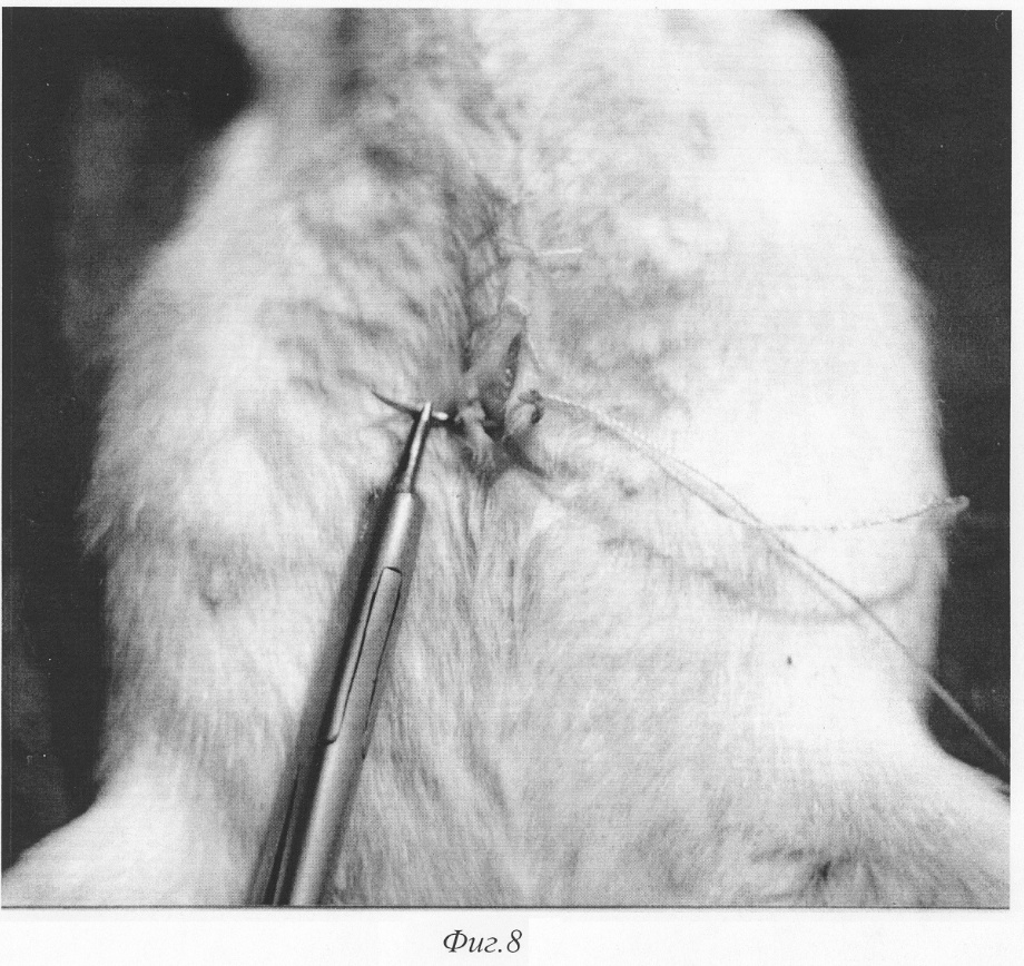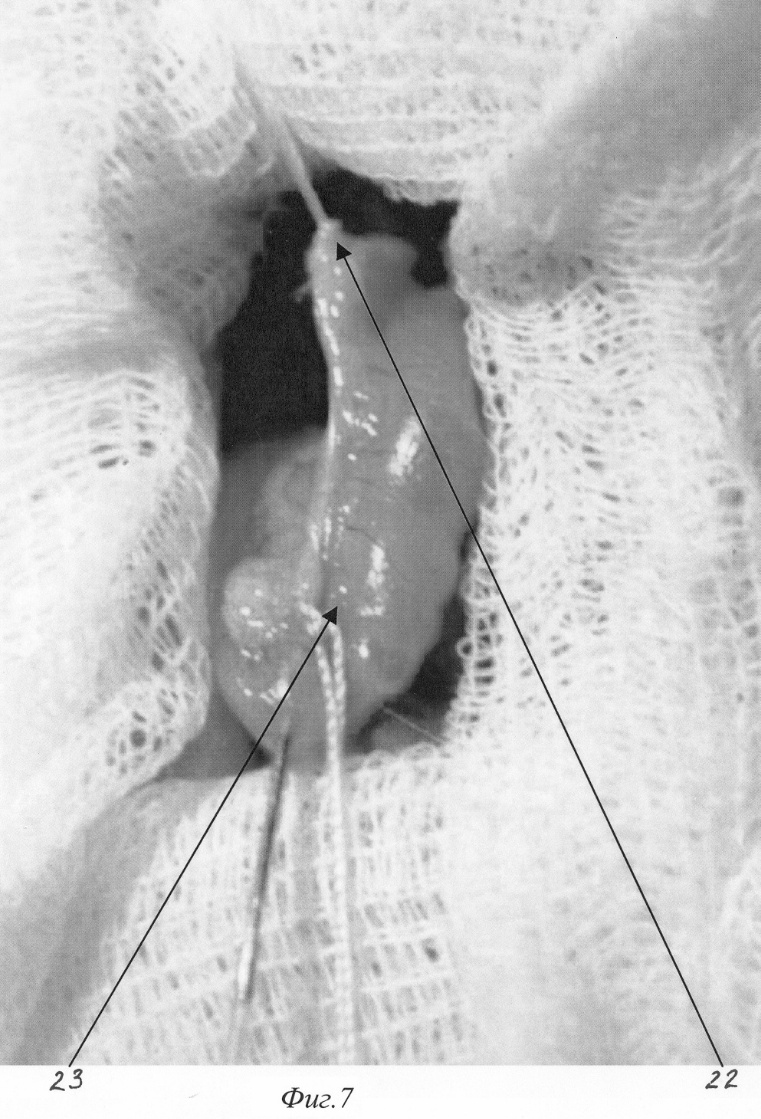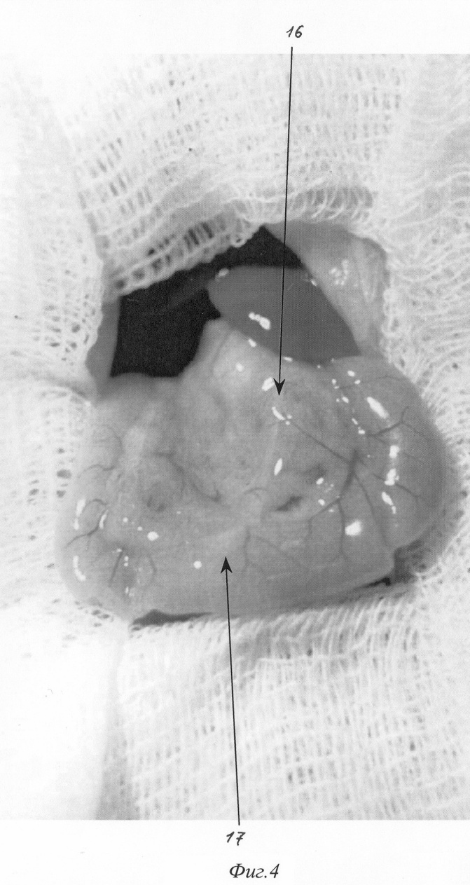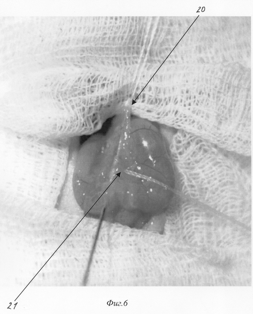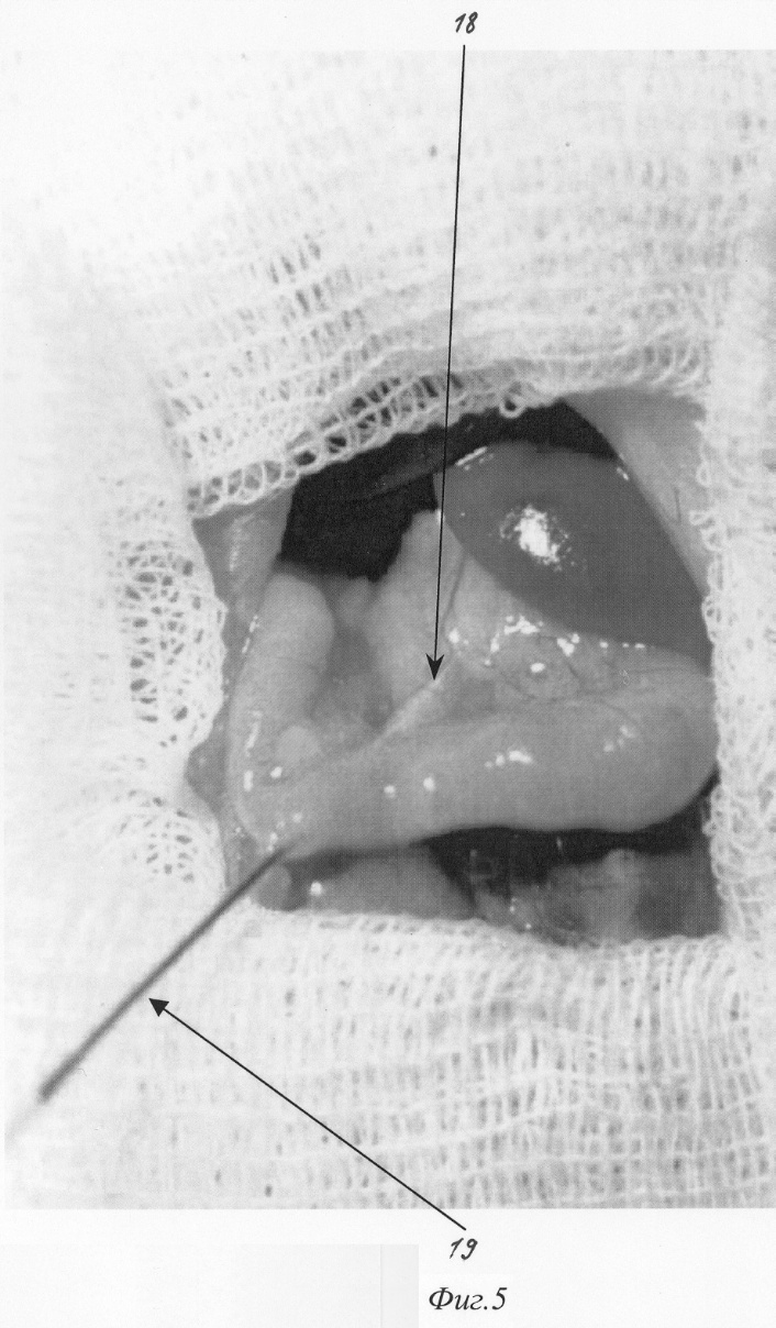 Изобретение относится к медицине, а именно к экспериментальной хирургии, и может быть использовано для моделирования острого деструктивного панкреатита у крыс. Близким решением является способ моделирования, разработанный Aho HJ, Koskensalo SM, и Nevalainen TJ, описанный в статье Experimental pancreatitis in the rat. Sodium taurocholate-induced acute haemorrhagic pancreatitis. Scand J Gastroenterol 15: 411-416, 1980. Который заключается в трансдуоденальной катетеризации общего желчного протока и введение таурохолата натрия (0,4 мл 4% раствора) в общий желчный проток и протоки поджелудочной железы. При использовании данного способа моделирования острого деструктивного панкреатита патогенетические механизмы, лежащие в основе большого количества летальных исходов, отличаются от таковых при развитии острого панкреатита в клинике. Так, таурохолат, являясь гемолитическим ядом, при применении в вышеуказанных концентрациях вызывает внутрисосудистый гемолиз. Другим отрицательным свойством данной модели является невозможность влияния на площадь панкреонекроза. Немаловажным фактором, влияющим на интрапанкреатическую активацию ферментов поджелудочной железы, является уровень рН в ее протоковой системе, что никак не учитывается в данной модели. Задачей изобретения является разработка модели острого панкреатита, наиболее оптимально соответствующей патогенетическим механизмам, имеющим место при развитии острого панкреатита у человека, позволяющей регулировать площадь панкреонекроза, а также снижение летальности, обусловленной гемолитическим действием вводимого в протоки раствора. Поставленная задача решаются тем, что для моделирования острого деструктивного панкреатита вместо раствора таурохолата натрия мы используем трансдуоденальное внутрипротоковое введение специальной буферной системы, содержащей соль желчной кислоты при оптимальной для интрапанкреатической активации ферментов рН. Для возможности управления площадью панкреонекроза мы используем различное наложение (дистальнее или проксимальнее места впадения добавочного протока поджелудочной железы в общий желчный проток) лигатуры, что обеспечивает развитие тотального или субтотального панкреонекроза. Изобретение поясняется фигурами: – на фиг.1 изображено строение протоковой системы крысы (1); – на фиг.2 изображено строение протоковой системы крысы (2); – на фиг.3 изображен первый этап моделирования (срединная лапаротомия); – на фиг.4 изображен второй этап моделирования (выведение органов в рану); – на фиг.5 изображен третий этап моделирования (пункция двенадцатиперстной кишки и катетеризация общего желчного протока); – на фиг.6 изображен пример наложения турникетов для воспроизведения субтотального панкреонекроза; – на фиг.7 изображен пример наложения турникетов для воспроизведения тотального панкреонекроза; – на фиг.8 изображен пятый этап моделирования – ушивание лапаротомной раны. Способ осуществляется следующим образом. Операция проводится с соблюдением правил асептики и антисептики под эфирным наркозом. После обработки операционного поля послойно вскрывается брюшная полость (верхнесрединная лапаротомия) на протяжении 2-3 см (фиг.3). Операционное поле отгораживается стерильными салфетками. При вскрытии брюшной полости в рану выводится петля двенадцатиперстной кишки (фиг.2. 12, фиг 4). В гепатодуоденальной связке 