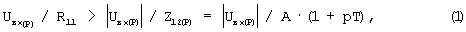 (1+pT) – операторное сопротивление пассивного четырехполюсника 12 с постоянным запаздыванием. Переходя в выражении (1) к единичной временной функции, получим условие срабатывания блока 13 сравнения в виде
