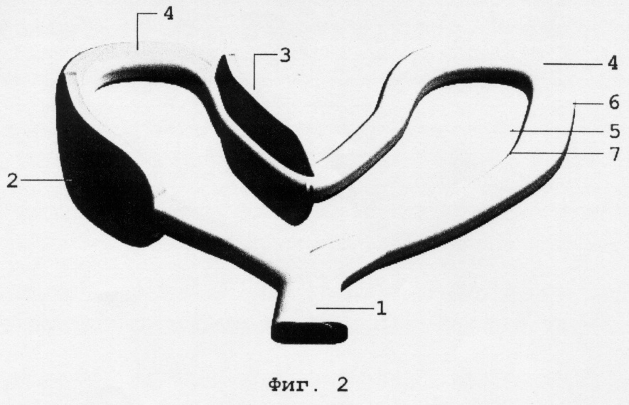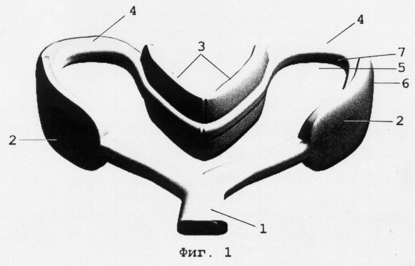 Ложка для одномоментного снятия оттисков с верхней и нижней челюстей, содержащая рукоятку и ложе для слепочного материала, выполненное в виде ленты, изогнутой по форме альвеолярного отростка с образованием сквозного паза для оттискного материала и включающей утолщенные рабочие поверхности, соединенные горизонтальными перемычками, отличающаяся тем, что утолщенные рабочие поверхности выполнены в виде вертикально расширяющихся бортов в области дефекта зубного ряда с вестибулярной и оральной поверхностей. РИСУНКИ