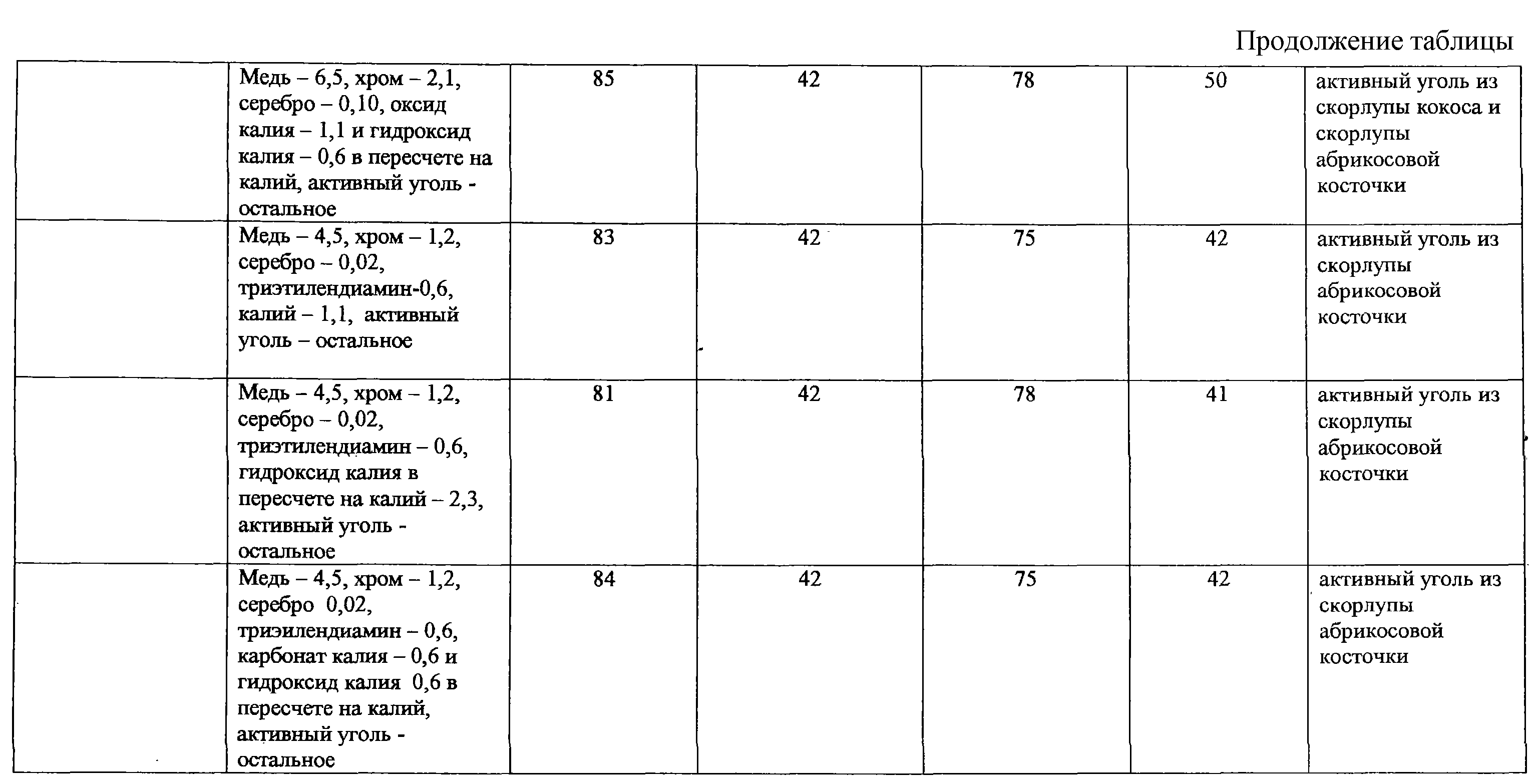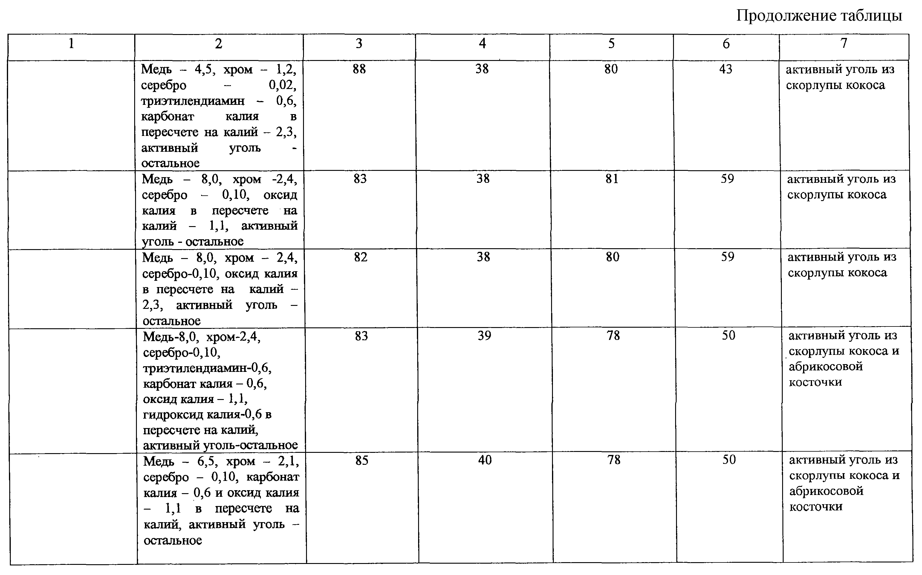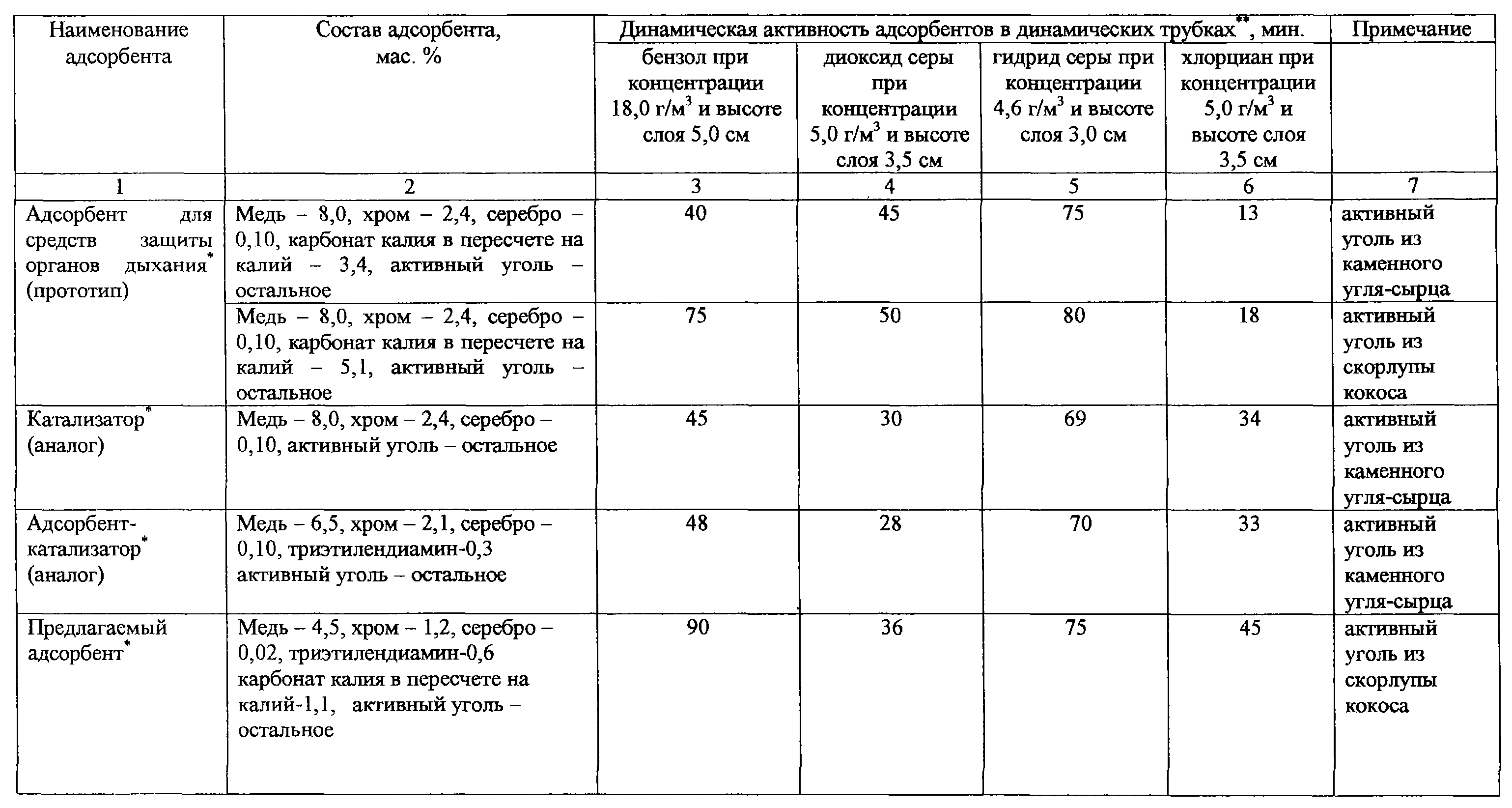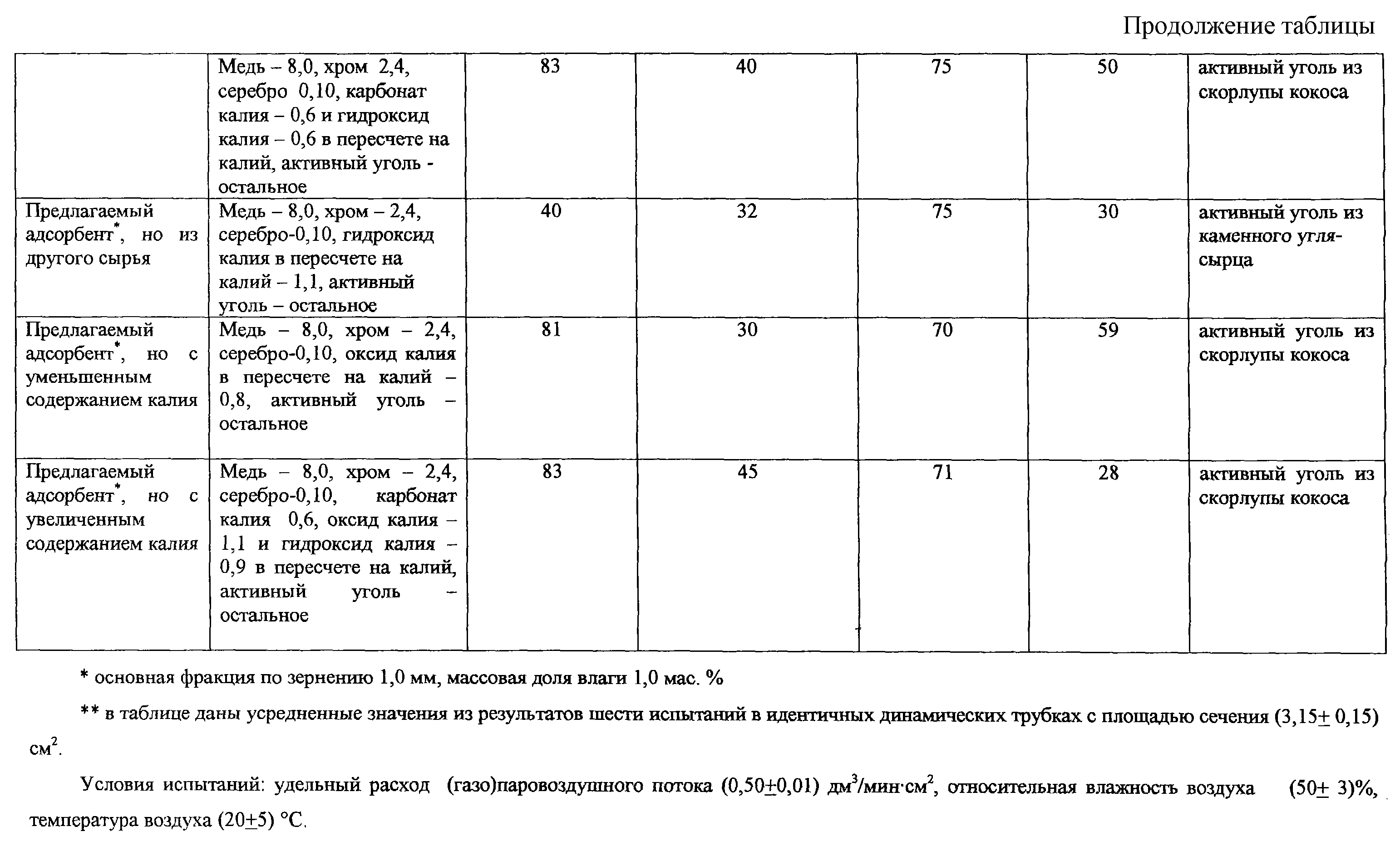 Изобретение относится к производству адсорбентов на угольной основе, в частности к производству адсорбента для поглощения аварийно химически опасных веществ ингаляционного действия органического кислого и нейтрального характеров, отравляющих веществ в средствах защиты. Адсорбент содержит (мас.%): оксиды и соли меди в пересчете на медь 4,5-8,0; оксиды и соли хрома в пересчете на хром 1,2-2,4; оксиды серебра в пересчете на серебро 0,02-0,10; карбонат калия и/или оксид калия, и/или гидроксид калия в пересчете на калий 1,1-2,3; активный уголь из скорлупы ореха и/или плодовой косточки остальное. Адсорбент может дополнительно содержать триэтилендиамин в количестве 0,3-0,6 мас.%. Адсорбент обладает достаточно высокой динамической активностью. 1 з.п. ф-лы, 1 табл. Изобретение относится к производству адсорбентов на угольной основе, в частности к производству для поглощения аварийно химически опасных веществ ингаляционного действия (АХОВИД) органического (бензол, толуол, ацетон и т.п.), кислого (диоксид серы, хлористый водород, фтористый водород и т.п.) и нейтрального (хлор, фтор, гидрид серы и т.п.) характеров, отравляющих веществ (циан водорода, хлорциан, фосген и т.п.) в средствах защиты. Известен катализатор [ТУ 2178-066-05795731-01 Катализатор, г. Пермь], представляющий собой активный уголь, импрегнированный соединениями меди в количестве 5,5-8,0 мас.%, хрома 1,4-2,4 мас.%, серебра 0,02-0,10 мас.% в пересчете на медь, хром и серебро. Катализатор обладает способностью поглощать отравляющие вещества. Например, известно, что хлорциан хемосорбируется на солях меди и затем гидролизуется адсорбированными парами воды в присутствии хрома. При этом аммиак, образующийся при гидролизе хлорида аммония, связывается медными солями в виде комплексов [Кинле X., Бадер Э. Активные угли и их промышленное применение. Перевод с немецкого. Ленинград, “Химия”, Ленинградское отделение, 1984, с.118]. Известен адсорбент с добавками меди, хрома, серебра и триэтилендиамина в количестве более 0,3 мас.% в качестве гидрофобной добавки [RU №2108149, кл. B 01 J 20/20, С 01 В 31/08, 20.02.1997]. Такого типа адсорбент-катализатор на основе активного угля АГ-5 [ГОСТ 20777-75. Уголь активный АГ-5] используется для снаряжения противогазовых коробок ГП-7к [ТУ Г-10-1104-82. Коробка фильтрующепоглощающая ГП-7к, комплект чертежей 3077.000. г. Электросталь], предназначенных для защиты населения от отравляющих веществ. Содержание соединений меди, хрома и серебра в пересчете на медь, хром и серебро в адсорбенте-катализаторе: медь – 4,5-6,5 мас.%, хром – 1,2-2,2 мас.%, серебро – 0,02-0,10 мас.%, триэтилендиамин – 0,3-0,6 мас.%. Известные адсорбенты-катализаторы обладают достаточно высокой динамической активностью по отравляющим веществам и АХОВИД нейтрального характера. Недостатком известных адсорбентов-катализаторов является недостаточно высокая динамическая активность по АХОВИД органического и кислого характеров. Известно, что предназначенные для адсорбции органических паров активные угли имеют динамическую активность по бензолу не менее 75 мин [АООТ “ЭХМЗ”, НПО “Неорганика” Активные угли. Эластичные сорбенты. Катализаторы. Осушители. Химические поглотители. Каталог. Черкассы, 1996, с.8-33]. Наиболее близким по технической сущности к предлагаемому адсорбенту является адсорбент для средств защиты органов дыхания [RU №2154525, кл. B 01 J 20/20, 20/20, A 62 D 9/00, 25.08.1999], представляющий собой