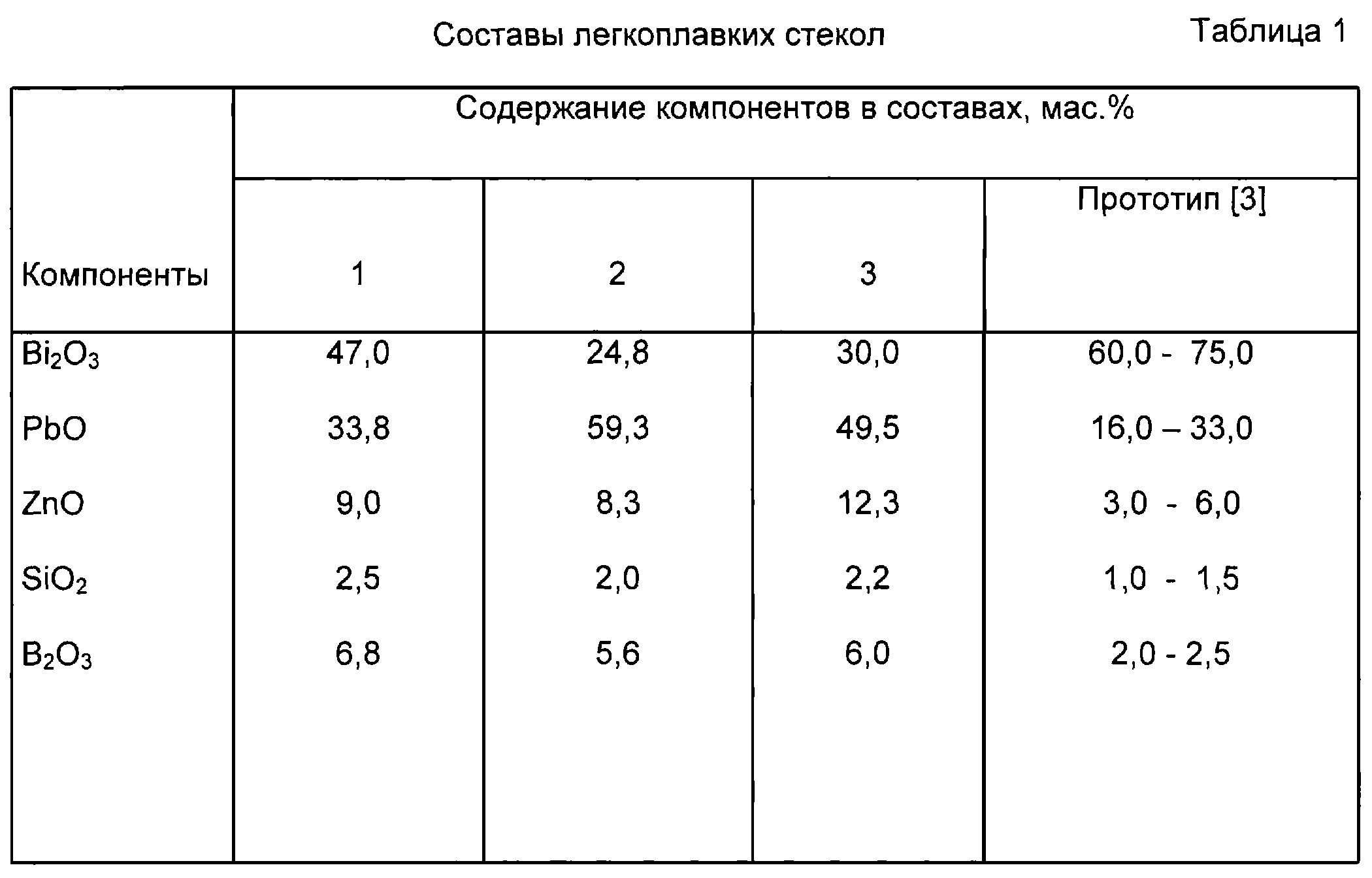 Легкоплавкое некристаллизующееся стекло предназначено для спаев, пассивации и герметизации микросборок и узлов в приборостроении, электронной технике и радиоэлектронике, в частности в качестве спая и герметика при сборке и монтаже блоков резонаторных кварцевых монометрических (БРКМ). Стекло включает компоненты при следующем соотношении, мас.%: Bi2O3 24,8-47,0; PbO 33,8-59,3; ZnO 8,3-12,3; SiO2 2,0-2,5; Bi2О3 5,6-6,8. Температурный коэффициент линейного расширения стекла 110-115·10-7К-1. Температура спаивания 450-470°С. Техническая задача изобретения – снижение ТКЛР для обеспечения согласованности ТКЛР стекла и спаиваемых материалов. 2 табл. Изобретение относится к составам легкоплавких некристаллизующихся стекол и предназначено для спаев, пассивации и герметизации микросборок и узлов в приборостроении, электронной технике и радиоэлектронике, в частности в качестве спая и герметика при сборке и монтаже блоков резонаторных кварцевых монометрических (БРКМ). Блоки резонаторные кварцевые монометрические состоят из измерительного и опорного резонаторов (или только измерительного), заключенных в кварцевый корпус, и предназначены для работы в пьезорезонаторных датчиках избыточного и абсолютного давления. Интервал рабочих давлений резонатора 0-60 МПа. Интервал рабочих температур от (-40) до (+80) Известно стекло для спая и герметика в производстве кварцевых высокотемпературных термочувствительных резонаторов, которое содержит, мас.%: РbО 80,5-82,5; В2O3 5,5-7,5; SiO2 0,5-0,9; ZnO 5,0-6,5; Сu2О 1,0-1,5; Вi2O3 1,0-2,5; Со2О3 1,5-3,5 [1]. Недостатком этого стекла является пониженный ТКЛР, приводящий к трещинноватости спая при минусовых температурах и к ухудшению температурно-частотных характеристик резонатора. Известно стекло, предлагаемое в качестве герметика, содержащее мас.%: РbО 72,5-77,0; В2O3 7,0-11,0; Вi2O3 6,0-12,0; ZnO 1,5-2,5; TI2O3 1,0-6,0; Nb2O5 0,5-1,3 [2]. Недостатком стекла является содержание в его составе высокотоксичного компонента – оксида таллия, что требует особых условий синтеза стекла. Наиболее близким к предлагаемому стеклу по технической сущности и достигаемому результату является стекло, содержащее, мас.%: Вi2О3 60,0-75,0; PbO 16,0-33,0; ZnO 3,0-6,0; SiO2 1,0-1,5; В2O3 2,0-2,5 [3]. Стекло обладает хорошей адгезионной прочностью и водостойкостью, однако ТКЛР стекла выше требуемых значений. Задачей предлагаемого изобретения является снижение ТКЛР в целях обеспечения согласованности ТКЛР стекла и спаиваемых материалов и создания прочного спая, позволяющего выдерживать резкий перепад рабочих температур резонатора без его разрушения. Для решения поставленной задачи предлагается легкоплавкое некристаллизующееся стекло, включающее Вi2О3, PbO, ZnO, SiO2, В2О3, которое содержит указанные компоненты при следующем соотношении, мас.%: Вi2О3 24,8-47,0; PbO 33,8-59,3; ZnO 8,3-12,3; SiO2 2,0-2,5; В2O3 5,6-6,8. Количественное соотношение указанных компонентов в предлагаемом составе легкоплавкого стекла позволяет получить согласованный спай и обеспечить его высокую прочность во всем интервале рабочих температур и, тем самым, обеспечить стабильность барочастотных характеристик резонатора и длительно сохранить вакуум (старение) в кварцевом изделии, соединенном легкоплавким стеклом. Из литературных источников неизвестно стекло для спая с данным соотношением компонентов и нами предлагается впервые. В качестве сырьевых материалов для варки стекла используют оксида висмута и цинка, 