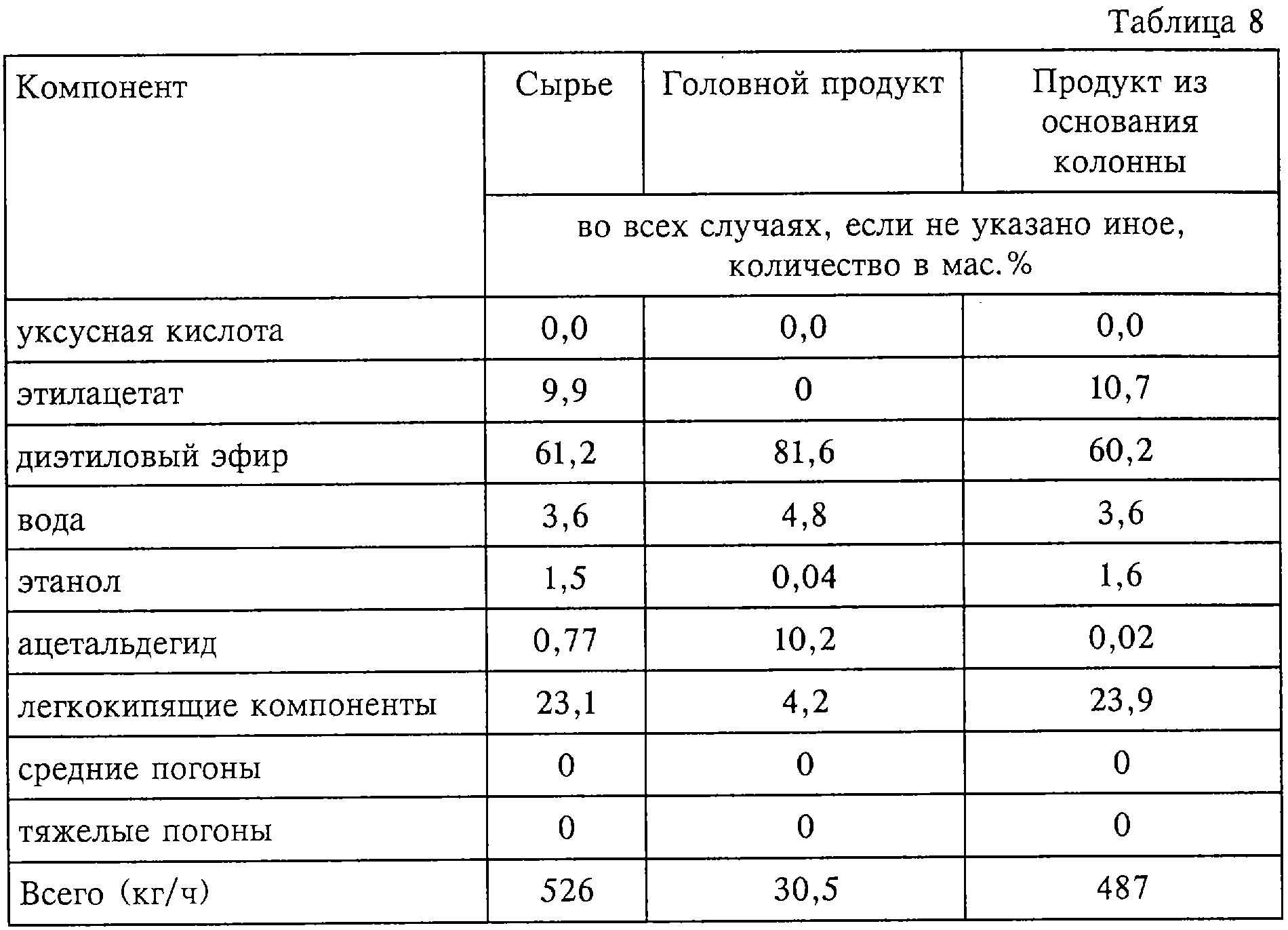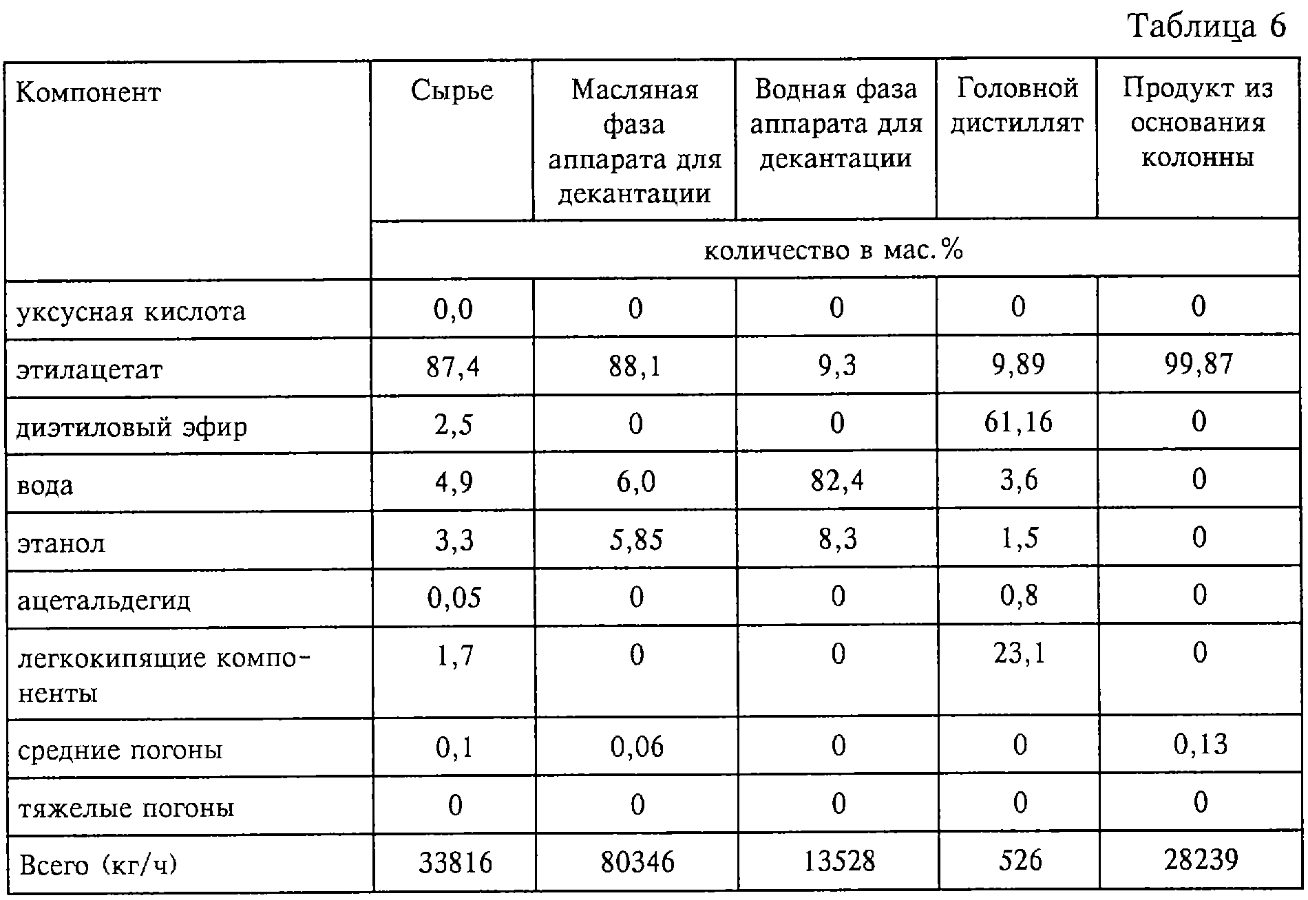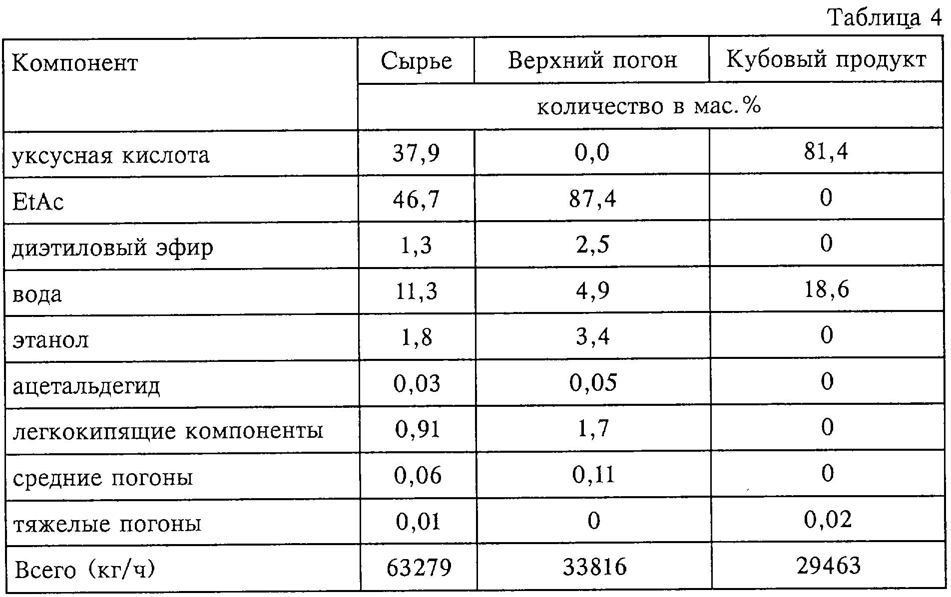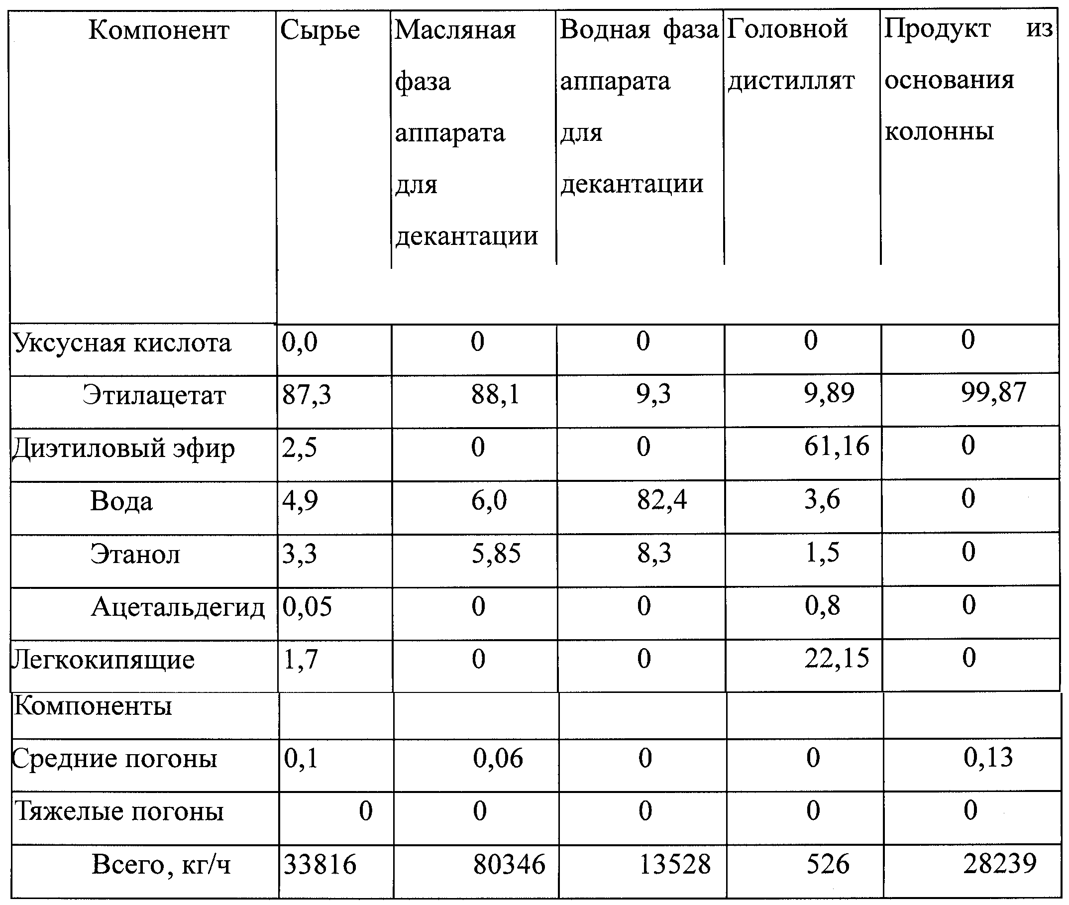 1. Способ очистки реакционных продуктов процесса прямого присоединения, включающего реакцию этилена с уксусной кислотой в присутствии кислотного катализатора с получением этилацетата и очистку продуктов рецикла, причем этот способ очистки включает следующие стадии: (I) подачу реакционных продуктов в колонну (А) для удаления кислоты, из основания которой отводят уксусную кислоту, а с ее верха отбирают по меньшей мере фракцию, включающую легкокипящие компоненты, содержащие помимо прочего углеводороды, этилацетат, этанол, диэтиловый эфир и воду, и направляют в аппарат (А1) для декантации с целью разделить эти верхние погоны на фазу, богатую этилацетатом, и водную (богатую водой) фазу; (II) отдельный возврат по меньшей мере части богатой этилацетатом фазы и практически всей водной фазы из аппарата (А1) для декантации в виде флегмы в верхнюю часть колонны (А) или вблизи ее верха; (III) подачу остальной части богатой этилацетатом фазы из аппарата (А1) для декантации в верхнюю часть рафинационной колонны (С) или вблизи ее верха; (IV) отвод из колонны (С) (а) недогона, включающего существенно рафинированный этилацетат, который направляют в очистную колонну (Е), (б) отбираемого из верха колонны продукта, включающего легкокипящие компоненты, содержащие помимо прочего ацетальдегид и диэтиловый эфир, который направляют в колонну для удаления альдегида, и (в) боковой фракции, включающей главным образом этилацетат, этанол и некоторое количество воды, которую отводят в точке, находящейся ниже точки ввода богатой этилацетатом фазы, удаляемой из колонны (А); (V) отвод сброса, включающего ацетальдегид, из верхней или вблизи верхней части колонны для удаления альдегида и возврата диэтилового эфира, выделенного из основания колонны для удаления альдегида, в этерификационный реактор и (VI) очистку рафинированного этилацетата в колонне (Е). 2. Способ по п.1, при котором кислотный катализатор, используемый для реакции присоединения, выбирают из фосфорнокислотного, фосфоновокислотного и гетерополикислотного катализаторов. 3. Способ по п.1 или 2, при котором катализатор нанесен на носитель. 4. Способ по любому из предыдущих пунктов, при котором колонна (А) работает при коэффициенте обратного потока органического материала 0,5:1, при этом возможно, что с учетом внутреннего орошения общий коэффициент обратного потока органического материала составляет 1:1 вследствие возврата в эту колонну по меньшей мере части органической фазы и всей водной фазы в качестве флегмы. 5. Способ по любому из предыдущих пунктов, при котором колонна (А) работает либо (а) в режиме этилацетатного заполнения, либо (б) в режиме водного заполнения. 6. Способ по любому из предыдущих пунктов, где на этапе (в) боковую фракцию, включающую главным образом этилацетат, этанол и некоторое количество воды, передают в статический смеситель, который обеспечивает гомогенное перемешивание и совмещение, и гомогенную смесь подают в аппарат для декантации (С1), который позволяет отделить органическую фазу, включающую этилацетат, от водной фазы, включающей этанол, и где органическая фаза, выходящая из аппарата для декантации (С1), возвращается в колонну (С). 7. Способ по п.6, где гомогенная смесь подается в аппарат для декантации после однократной или многократной промывки органической фазы водой для удаления этанола