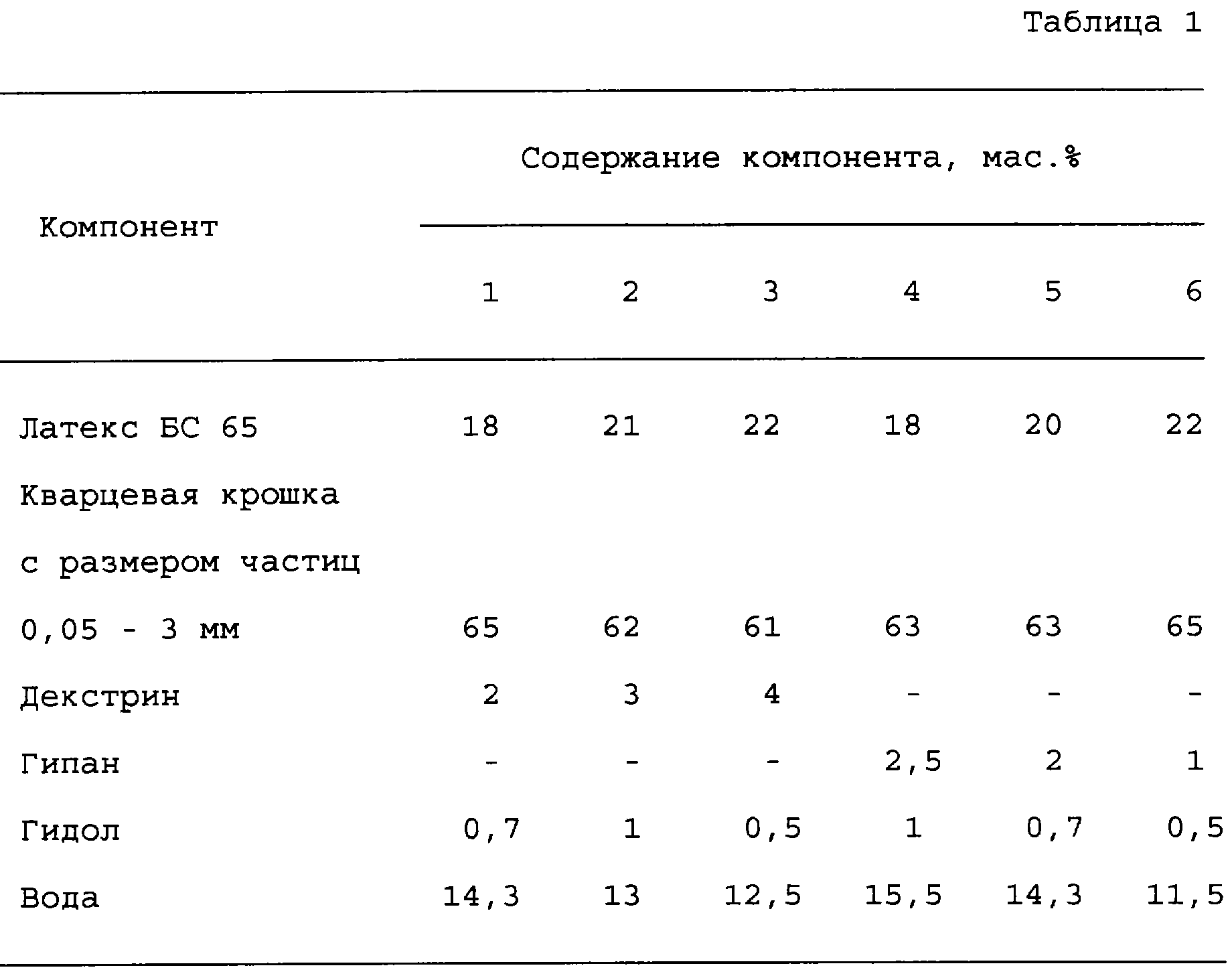 1. Краска, включающая связующее – латекс бутадиенстирольного сополимера, наполнитель в виде крошки, загуститель и воду, отличающаяся тем, что она содержит в качестве латекса бутадиенстирольного сополимера латекс марки БС 65, в качестве наполнителя кварцевую крошку с размером частиц от 0,05 до 3 мм, в качестве загустителя декстрин и дополнительно гидол при следующем соотношении компонентов, мас.%: Латекс бутадиенстирольного сополимера БС 65 18-22 Кварцевая крошка с размером частиц от 0,05 до 3 мм 61-65 Декстрин 2-4 Гидол 0,5-1,0 Вода 12,5-14,3 2. Краска, включающая связующее – латекс бутадиенстирольного сополимера, наполнитель в виде крошки, загуститель гидролизованный полиакрилонитрил-гипан и воду, отличающаяся тем, что она содержит в качестве латекса бутадиенстирольного сополимера латекс марки БС 65, в качестве наполнителя кварцевую крошку с размером частиц от 0,05 до 3 мм и дополнительно гидол при следующем соотношении компонентов, маc.%: Латекс бутадиенстирольного сополимера БС 65 18-22 Кварцевая крошка с размером частиц от 0,05 до 3 мм 61-65 Гидролизованный полиакрилонитрил – гипан 1,0-2,5 Гидол 0,5-1,0 Вода 11,5-15,5 MM4A – Досрочное прекращение действия патента СССР или патента Российской Федерации на изобретение из-за неуплаты в установленный срок пошлины за поддержание патента в силе