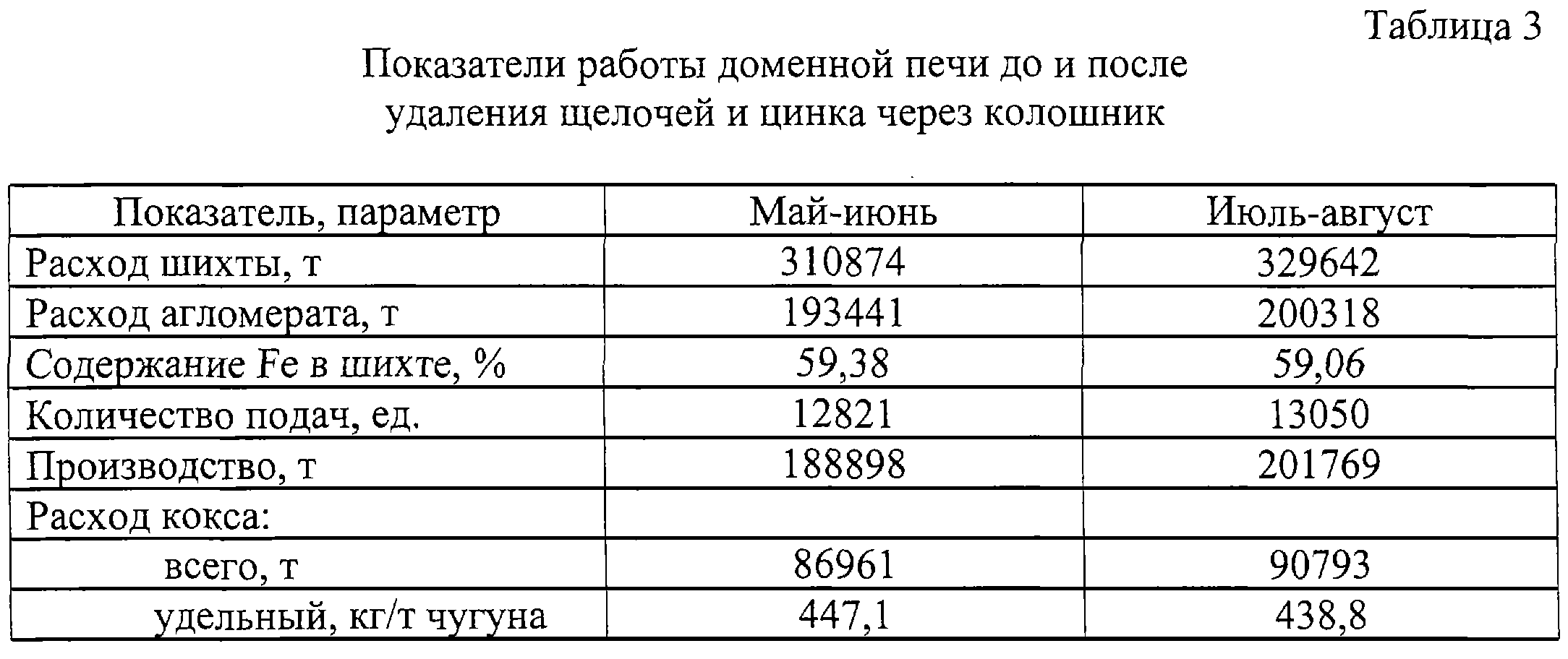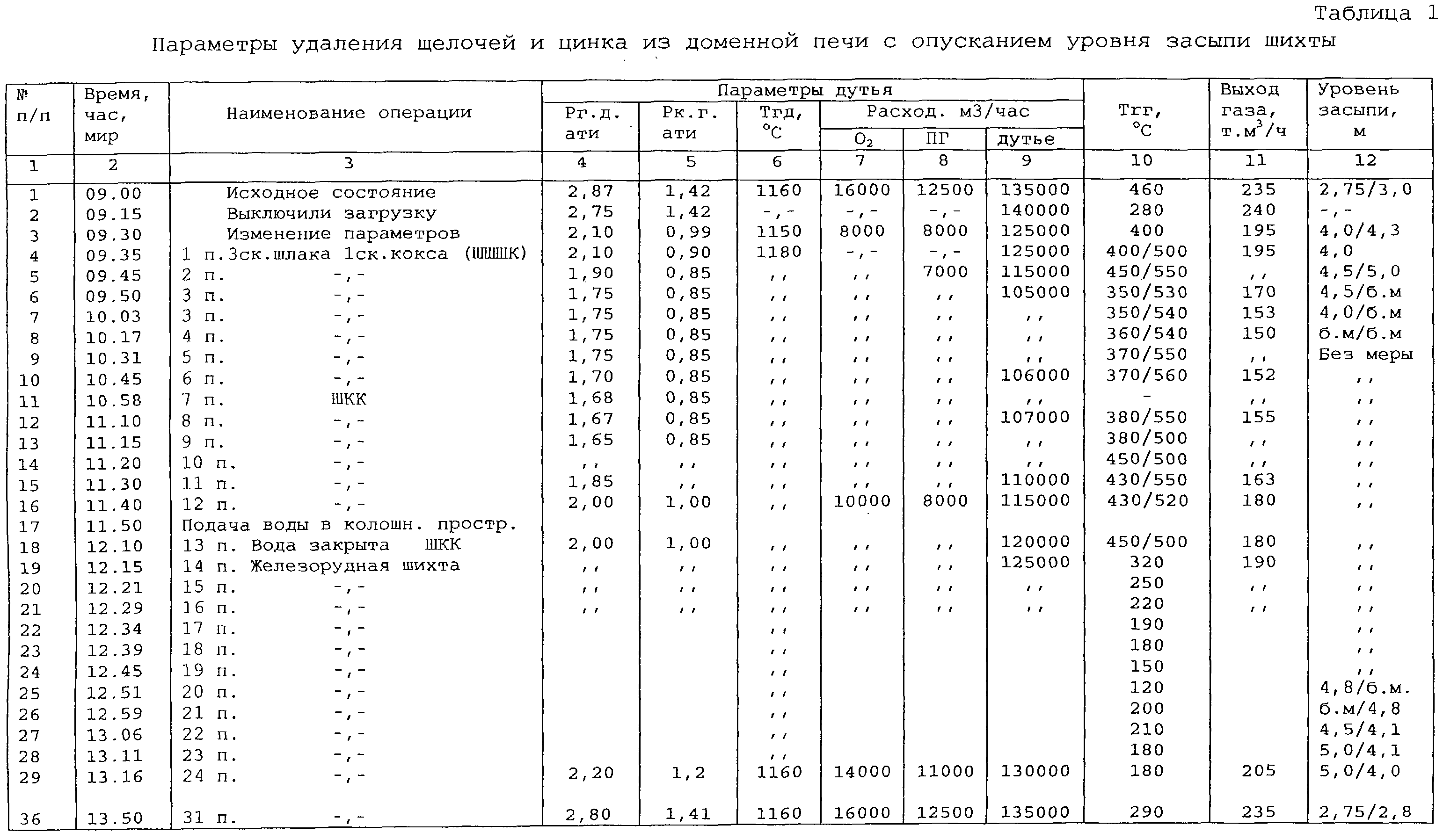 Изобретение относится к черной металлургии и может быть использовано в доменной плавке. В способе, включающем загрузку шихты, содержащей цинк и щелочь, подачу дутья, контроль температуры и выхода колошникового газа, формируют буферный слой загрузкой в доменную печь фракционированного шлакового щебня и кокса, опускают уровень засыпи до горизонта с температурой газа 750-800 Изобретение относится к черной металлургии и может быть использовано в доменной плавке материалов, содержащих щелочи и цинк. Известен способ доменной плавки цинксодержащих шихт [1], включающий загрузку шихты, содержащей цинк, подачу дутья, контроль температуры и выхода колошникового газа, загрузку кокса с определением высоты слоя, периодическое опускание уровня засыпи шихты. Недостатком данного способа является то, что на формирование буферного слоя единовременно расходуется значительное количество (45-90 т) дефицитного кокса и выход щелочей, при высоком выходе цинка, недостаточно эффективен. Наиболее близким по технической сущности и достигаемому результату является способ доменной плавки цинксодержащих шихт [2], включающий загрузку шихты, содержащей цинк, подачу дутья, контроль температуры и выхода колошникового газа, загрузку и формирование буферного слоя определенной высоты, периодическое опускание уровня засыпи шихты до повышения температуры колошникового газа до 450-500 Недостатком данного способа является недостаточно высокая степень удаления цинка и низкая степень удаления щелочей. Предлагаемым изобретением решается задача эффективного удаления из печи цинка и накапливающихся щелочей. Для достижения указанного результата в способе доменной плавки щелочь- и цинксодержащих шихт, включающем загрузку шихты, содержащей цинк, подачу дутья, контроль температуры и выхода колошникового газа, загрузку кокса и фракционного шлакового щебня, формирование буферного слоя определенной высоты, периодическое опускание уровня засыпи шихты, уровень засыпи опускают до горизонта с температурой газа 750-800 Предлагаемый способ основан на том, что повышение температуры газа (до 500 Необходимость охлаждения газа на колошнике до 500 Предлагаемый способ был испытан на доменной печи объемом 1373 м3. Перед испытанием способа печь работала со следующими параметрами. Загружали шихту, состоящую из местного агломерата (57%), окатышей Соколовско-Сарбайского ГОКа (39%) и Михайловского ГОКа (4). Выход газа составлял 1385 м3/т чугуна с температурой 280 В 9 ч 15 мин прекратили загрузку щелочь- и цинксодержащей шихты, в 9 ч 30 мин изменили параметры дутья, в результате чего выход газа уменьшился с 235 до 195 тыс.м3/ч (табл.1). В 9 ч 35 мин начали формирование буферного слоя загрузкой 12 подач, в том числе 6 подач с 1 скипом фракционного шлакового щебня и с 2 скипами кокса и 6 подач с 3 скипами щебня и 1 скипом кокса. Загрузку производили, ориентируясь по температуре колошникового газа 480-500 Последнюю подачу щебня и кокса загрузили в 11 ч 40 мин. В 11 ч 50 мин в колошниковое пространство начали подавать воду в количестве 22 м3/мин. Уровень засыпи опускали до горизонта с температурой газа 750-780 В 12 ч 10 мин прекратили подачу воды и в печь загрузили 1 скип щебня и 2 скипа кокса, после чего начали загружать нормальную железорудную шихту. В 13 ч 50 мин рабочее положение уровня засыпи, параметры дутья, расход природного газа и ки