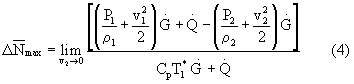 Изобретение относится к энергетике, в частности к способам преобразования энергии. Под термином “тепловая поточная машина” подразумевается система или устройство, в котором специально организованный газовый поток осуществляет некоторый полезный эффект (преобразование части энергии газового потока в другие виды энергии). Эти машины представлены широким классом газовых машин, в котором в явном виде технической работы не совершается, – это вихревые устройства различного предназначения, химические газовые реакторы, эжекторы, плазмотроны, смесители, акустические газовые устройства и т.д. Например, в вихревых трубах происходит сепарация газового потока на холодную (на оси трубы) и горячую (на периферии) составляющие [1]. В данном случае полезным эффектом является охлаждение или нагревание внешних тел за счет сепарации газового потока. Другим примером полезного эффекта в описанных тепловых машинах могут служить газовые акустические устройства, в которых происходит целенаправленное преобразование части энергии газового потока в энергию акустических колебаний среды. Общим свойством указанного класса тепловых машин является тот факт, что их эффективность тем выше, чем выше степень преобразования энергии газового потока в потенциальную энергию давления. Известен способ преобразования энергии в тепловой поточной машине (тепловом насосе) путем подведения мощности газового потока на входе в машину и тепловой мощности к машине (см. RU 2083932 C1, F 25 В 30/00, 10/07/1997). В известном способе определяют максимальный коэффициент преобразования применительно к переносу тепла с более низкого уровня на более высокий уровень. Недостатком известного способа является невозможность его применения к области задач без переноса тепла. Технический результат, на достижение которого направлено настоящее изобретение, заключается в создании способа с максимальным коэффициентом преобразования в тепловой поточной машине. Данный технический результат достигается тем, что в способе преобразования энергии в тепловой поточной машине путем подведения мощности газового потока рабочего тела на входе в машину и тепловой мощности к машине, определения статических температур на входе и на выходе из сопла определяют удельную тепловую мощность, подведенную к машине, а максимальный коэффициент преобразования энергии определяют по формуле: где К – отношение теплоемкостей, Ср – теплоемкость рабочего тела при постоянном давлении; Сv – теплоемкость рабочего тела при постоянном объеме;