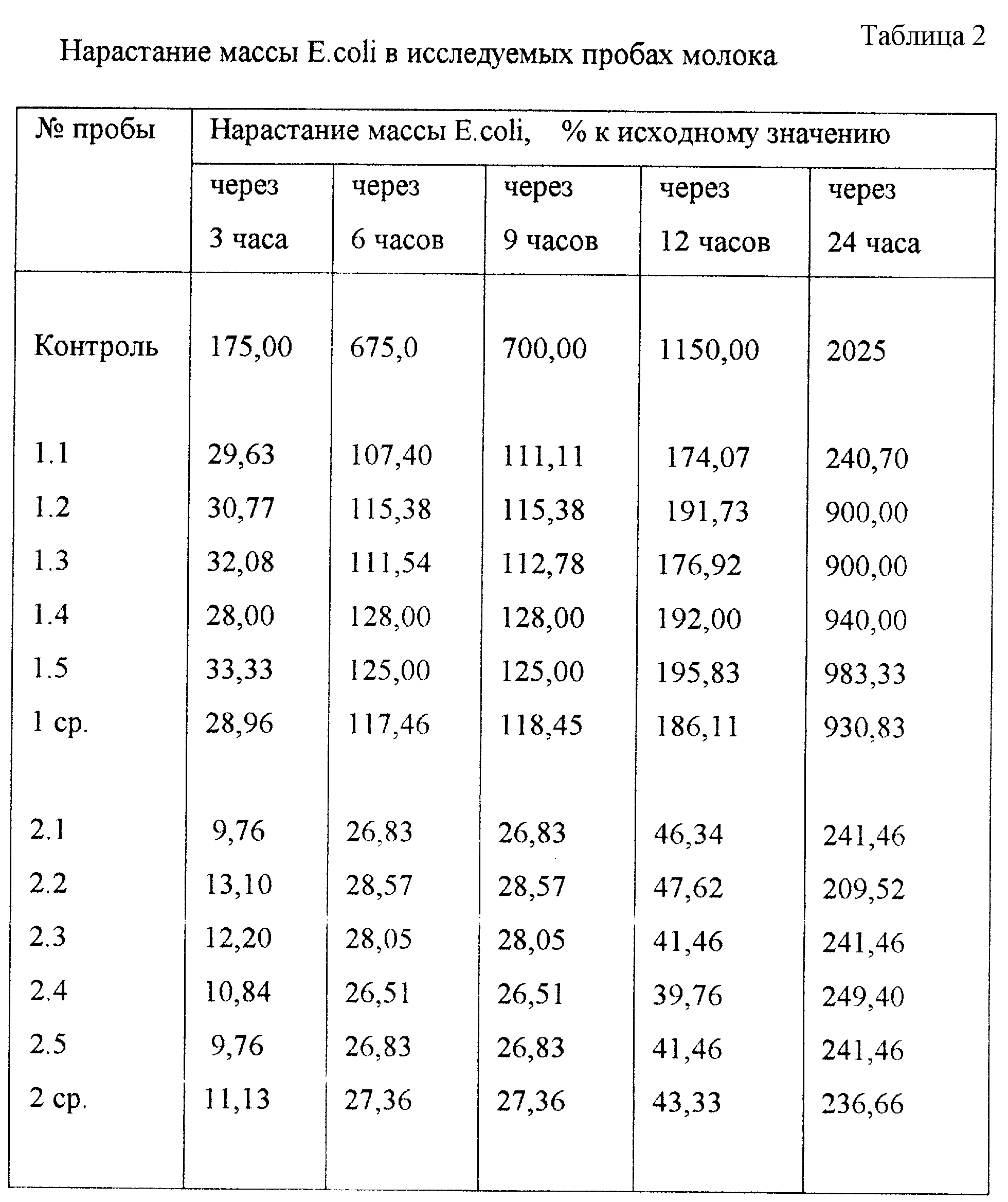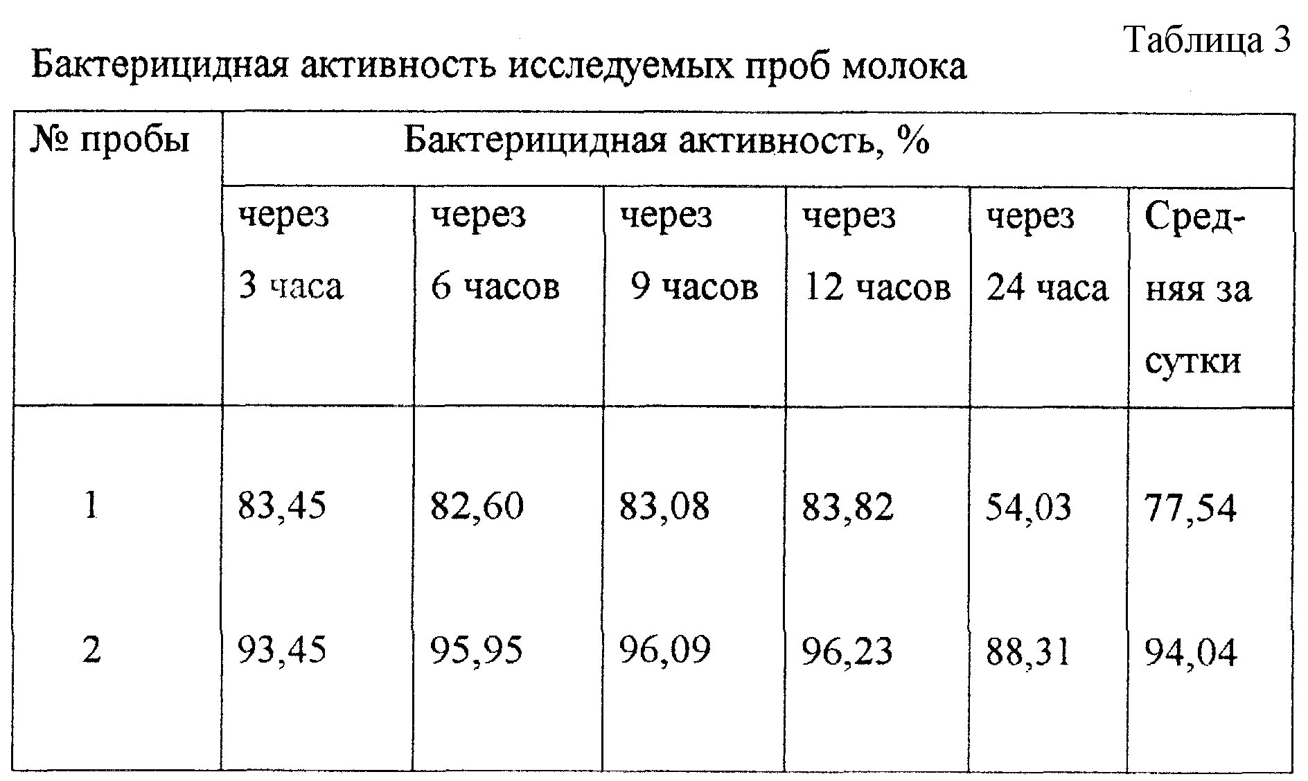 Способ определения бактерицидной активности молока, предусматривающий внесение исследуемой пробы в питательную среду, термостатирование и оценку бактерицидной активности молока, отличающийся тем, что в питательную среду, в качестве которой используют мясопептонный бульон, наряду с исследуемой пробой молочной сывороткой вносят тест-культуру E.coli с оптической плотностью 0,45-0,55, определенной фотоэлектрокалориметрическим методом при длине волны, равной 550 нм, оценку бактерицидной активности ведут путем сравнения оптической плотности мясопептонного бульона с добавлением тест-культуры E.coli и молочной сыворотки и без добавления последней с последующим термостатированием при температуре (38 где НМ – нарастание массы E.coli, в процентах от исходного значения; Д1 – первоначальная оптическая плотность пробы; Д2 – оптическая плотность пробы через расчетный промежуток времени; где БА – бактерицидная активность молока через расчетный промежуток времени, %; НМконтр – нарастание массы E.coli в контрольной пробе, %; НМоп – нарастание массы E.coli в опытной пробе, %; где БАср – средняя бактерицидная активность молока в течение 24 ч, %; БА3 – бактерицидная активность молока через 3 ч, %; БА6 – бактерицидная активность молока через 6 ч, %; БА9 – бактерицидная активность молока через 9 ч, %; БА12 – бактерицидная активность молока через 12 ч, %; БА24 – бактерицидная активность молока через 24 ч, %. MM4A Досрочное прекращение действия патента Российской Федерации на изобретение из-за неуплаты в установленный срок пошлины за поддержание патента в силе