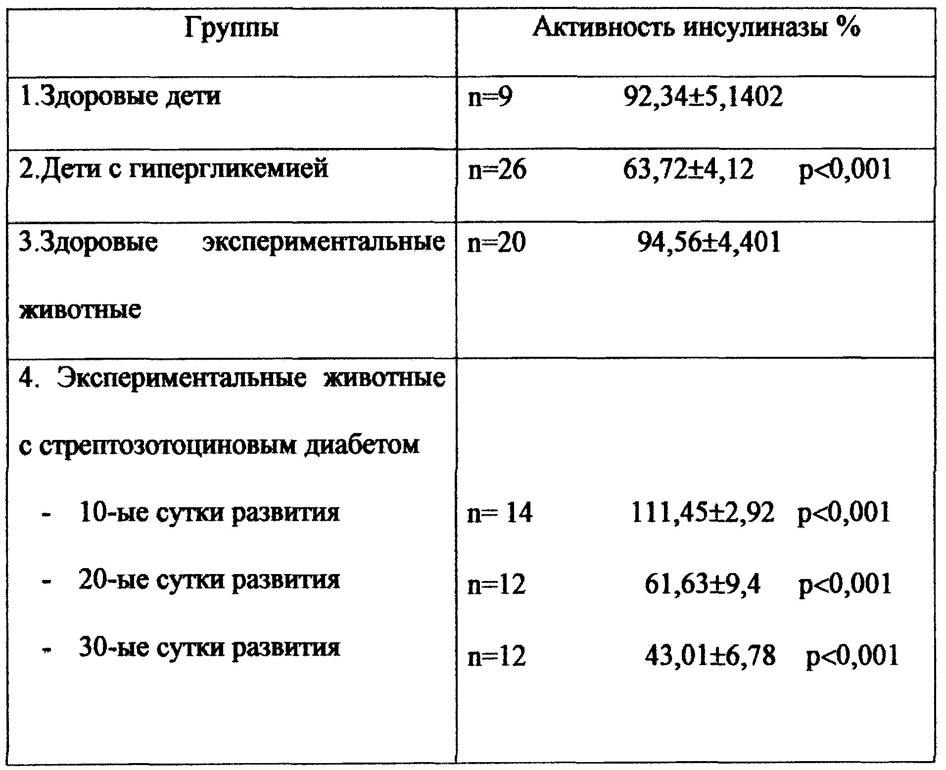Изобретение относится к области медицины, в частности к экспериментальной и клинической иммунологии. Способ обеспечивает повышение доступности и надежности определения инсулиназной активности эритроцитов млекопитающих. Гемолизат предварительно инкубируют с немеченым инсулином в соотношении 4:1, уровень инсулина до и после инкубации определяют по изменению оптической плотности раствора при длине волны 540 нм. 1 табл. Изобретение относится к разделу экспериментальной и клинической иммунологии и биохимии и может быть использовано в НИИ и в отделениях больниц при обследовании больных с повышенным уровнем сахара в крови. Наиболее близким способом того же назначения к заявленному способу является способ определения инсулиназной активности эритроцитов, включающий инкубацию исследуемого гемолизата эритроцитов с меченым [125J]-иисулином, растворение фрагментов разрушенного [125 К причинам, препятствующим достижению указанного результата при использовании известного способа, принятого за прототип, относят то, что в известном способе в инкубации гемолизата используется радиоактивный инсулин, являющийся нестабильным соединением с периодом полураспада 3-8 мин (Duckworth W.C. Insulin degradation: mechanisms, products and significance), при этом сам способ требует специальной радиоиммунологической лаборатории с определенной степенью защиты лаборатории. Инсулиндеградирующие ферменты инсулиназы обнаружены во многих органах и тканях [1, 2], в том числе и в эритроцитах человека [3, 4]. Из-за сложности биохимических методов определения инсулиназ определение их как с научно-исследовательской целью, так и в клинической практике ограничено. Технический результат – повышение доступности и надежности метода. Сущность изобретения заключается в следующем. Инкубацию гемолизата эритроцитов производили с раствором немеченого инсулина, взятых в соотношении 4:1 соответственно (5 мл гемолизата:1,25 мл раствора инсулина) в течение 1,5 часов при температуре 37 Проведенный заявителем поиск по патентным источникам информации и выявление источников, содержащих сведения об аналогах заявленного изобретения, позволил установить, что заявитель не обнаружил аналогов, характеризующихся признаками, тождественными всем существующим признакам заявленного изобретения. Следовательно, заявляемое изобретение соответствует условию “новизна”. Предлагаемый способ определения инсулиназной активности эритроцитов может быть реализован следующим образом (на примере). Пример. Из вены пациента отбирают 3 мл крови в гепаринизированные пробирки, добавляют 6 мл физиологического раствора и, после трехкратного центрифугирования при 3000 g в течение 5 мин и температуре -4 Предлагаемым способом была определена инсулиназная активность эритроцитов 9 здоровых детей (7-14 лет) и 26 детей (7-14 лет) с гипергликемией. Кроме того, активность фермента оценивалась в эритроцитах белых беспородных крыс весом 100-150 г со стрептозотоциновым диабетом (уровень глюкозы в сыворотке крови не менее 13,5 ммоль/л) – 20 здоровых животных и 38 – с экспериментальным СЗТЦ диабетом. В таблице приведены результаты исследования. Таким образом, вышеизложенные сведения свидетельствуют о выполнении при использовании заявляемого следующей совокупностью условий: – способ определения инсулиназной активности эритроцитов, воплощающий заяв