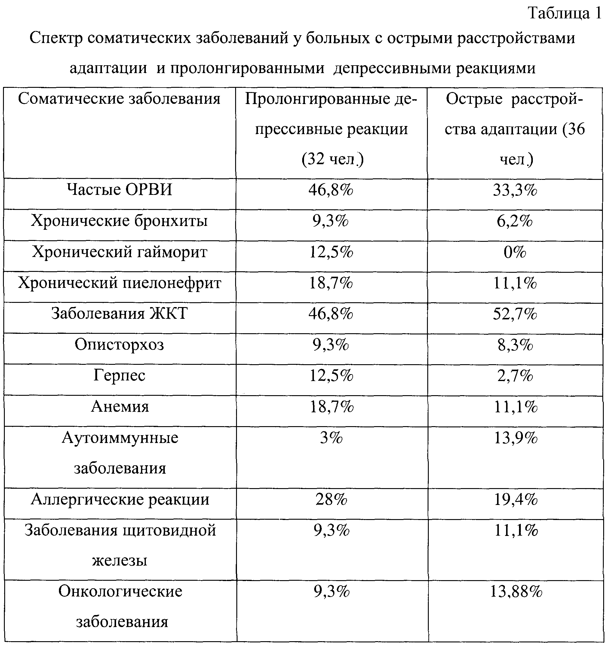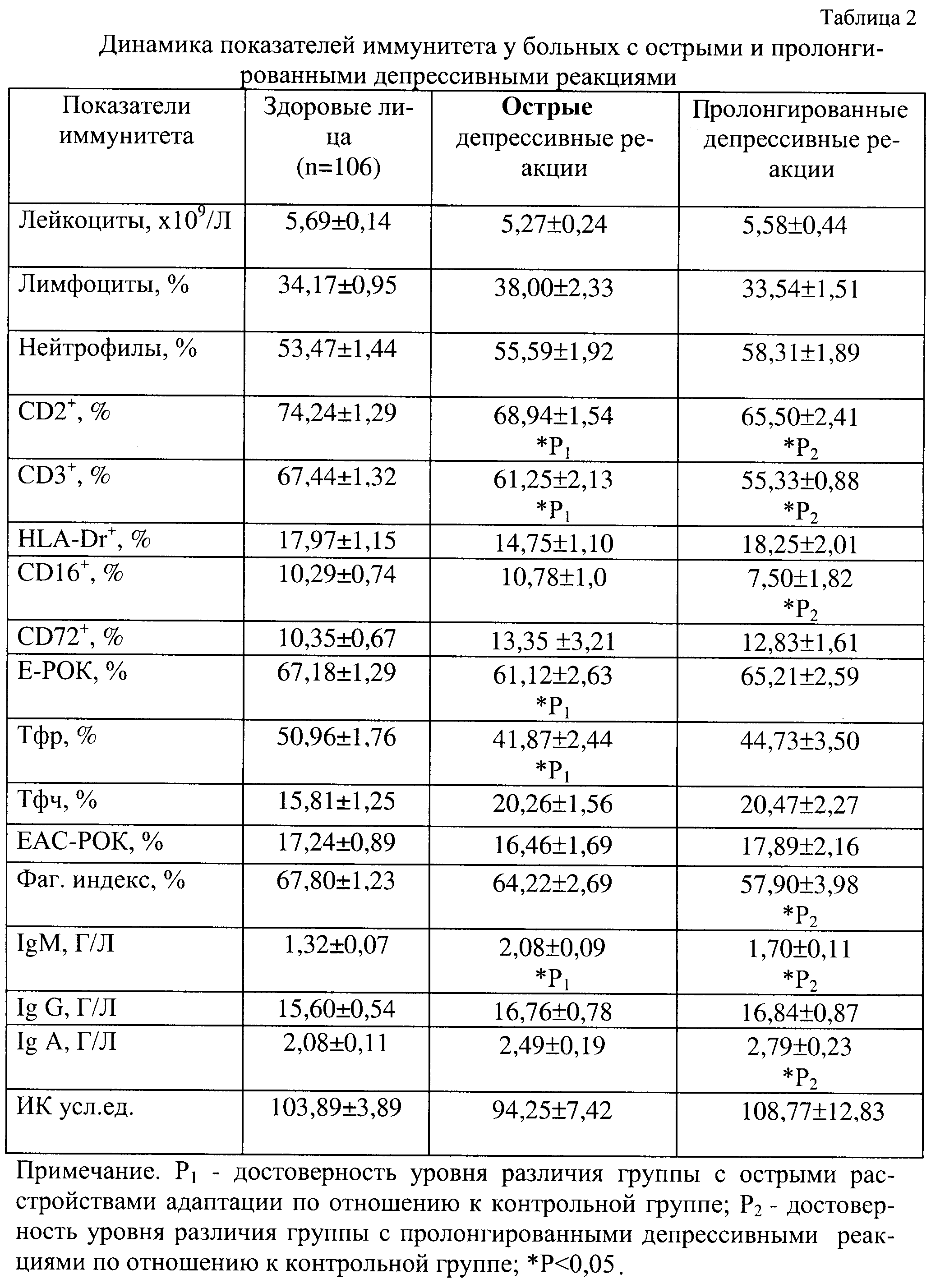 Изобретение относится к области медицины, а именно к психиатрии, и может быть использовано для прогноза течения депрессивных реакций. Сущность изобретения состоит в том, что при наличии сопутствующей соматической патологии и снижении содержания натуральных киллеров до 8% и менее и фагоцитарной активности лейкоцитов до 60% и менее прогнозируют пролонгированное течение депрессивных реакций. Техническим результатом является прогнозирование течения депрессивной реакции на ранних этапах и целенаправленное проведение реабилитационных психотерапевтических и фармакологических мероприятий. 2 табл. Изобретение относится к медицине, а именно к психиатрии, и может быть использовано для прогноза течения депрессивных реакций. Известен способ прогнозирования степени тяжести клинической симптоматики психогенной депрессии на основании иммунологического и гормонального обследования пациента [1]. Задачей предлагаемого изобретения является прогнозирование течения депрессивных реакций. Поставленная задача достигается путем определения спектра сопутствующих соматических заболеваний и иммунологических показателей у пациента, причем при наличии сопутствующей хронической соматической патологии и снижении содержания натуральных киллеров до 8% и менее и фагоцитарной активности лейкоцитов до 60% и менее прогнозируют пролонгированное течение депрессивных реакций. Предлагаемые критерии (наличие хронической соматической патологии и снижение содержания натуральных киллеров и фагоцитарной активности лейкоцитов у пациента) пролонгированного течения депрессивных реакций были получены в результате клинико-иммунологического обследования 68 женщин с депрессивными реакциями, проходивших курс лечения в отделении аффективных состояний клиник ГУ НИИ психического здоровья ТНЦ СО РАМН. Средний возраст больных составил 36,7 Использовали углубленный опрос с помощью “Анкеты клинической до-лабораторной диагностики признаков иммунологической недостаточности”, разработанной в лаборатории клинической психонейроиммунологии ГУ НИИ психического здоровья ТНЦ СО РАМН, которая позволяет выявить клинические синдромы иммунной недостаточности и сопутствующую соматическую патологию. У психически больных и в контрольной группе здоровых лиц кровь для иммунобиологических исследований брали из локтевой вены, утром, натощак. Использовали комплекс иммунологических тестов: показатели, характеризующие клеточный иммунитет (определение количества иммунокомпетентных клеток с различными фенотипами поверхностных рецепторов), показатели гуморального иммунитета (определение концентрации сывороточных иммуноглобулинов классов М, G, А и уровня циркулирующих иммунных комплексов); фагоцитарную активность лейкоцитов по методике Р.В. Петрова с соавт. (1992). При сравнении синдромов иммунной недостаточности у больных с пролонгированными депрессивными реакциями (первая группа) и острыми расстройствами адаптации (вторая группа) выявлено (табл.1), что в первой группе достоверно чаще наблюдаются проявления инфекционного синдрома и тенденция к хронизации соматических заболеваний (ОРВИ несколько раз в год, часто со слабой температурной реакцией и повышенной чувствительностью к герпесу, хронические тонзиллиты, бронхиты, гаймориты, пиелонефриты). Наличие