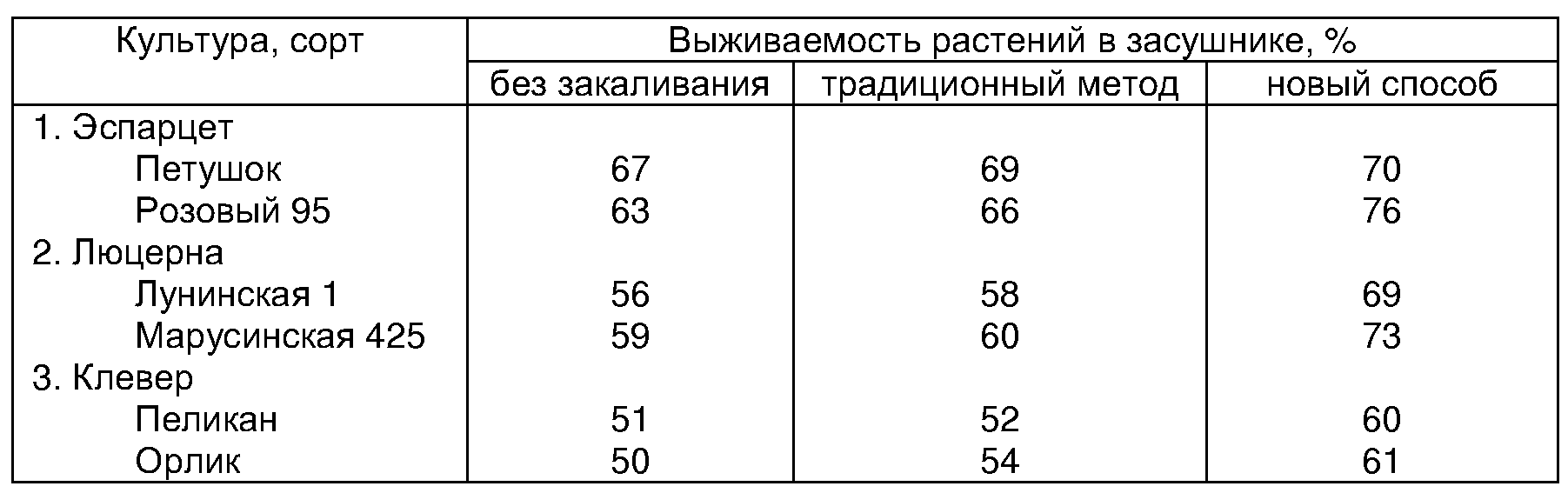 Изобретение относится к области сельского хозяйства и может быть использовано для защиты растений от засухи. Способ заключается в трехкратном в течение трех суток попеременном замачивании семян в водных растворах аминокислоты пролина, сахарозы и глюкозы с последующим подсушиванием путем искусственного вентилирования нагретым до 38-40°С воздухом. При этом, первый раз используют теплый водный раствор (30-35°С) с весовым соотношением компонентов воды, аминокислоты пролина и сахарозы соответственно 100:1:4, второй раз – вместо сахарозы глюкозу с соотношением компонентов 50:1:5, в третий раз – то же, что и во второй, но с соотношением- 20:1:4. Способ позволяет повысить выживаемость бобовых кормовых культур (эспарцета, клевера и люцерны) при выращивании их в условиях жесткого водного дефицита. 1 табл.
