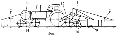 Культиватор 1 снабжен плоскорежущими лапами 9 с наклоненными к направлению движения стойками 10 (см. фиг.3 и 4).