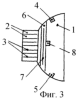 Устройство для оценки динамики показателей дыхания используется следующим образом: перед обследованием обрабатывают дыхательную маску 1 дезинфицирующим раствором, затем надевают дыхательную маску 1 (фиг.1) и включают устройство. Устройство может иметь автономную электрическую систему и быть портативным, как электронные часы, в котором размещаются усилители, интегратор, регистратор, память, батарейка питания и прочие элементы электрической схемы устройства. Если устройство используется стационарно в специализированном кабинете, то, например, при велоэргометрии или прочей нагрузочной пробе оно может быть присоединено проводами к регистратору или персональному компьютеру через аналого-цифровой преобразователь. Также обследование человека при движениях в залах или в полевых условиях можно использовать дистанционную передачу сигналов, при этом устройство может иметь выход с передатчиком на приемное устройство, с которого сигнал поступает на регистратор или персональный компьютер для обработки поступающих сигналов. При дыхании в состоянии покоя и при различных видах нагрузки дыхательные объемы воздуха не встречают сопротивления, проходя через выходное отверстие 2 между пластинами 3 (фиг.2, 3, 4). При этом выдыхаемый воздух, проходя между пластинами 3 расстояние, между которыми не более двух миллиметров, покрытыми диэлектриком, которые представляют собой конденцатор, регистрируют в зависимости от измененного состава воздуха при вдохе и выдохе емкостные изменения, при этом другая часть пластин, расстояние между которыми также не более двух миллиметров, не покрытая диэлектриком, а покрыта токопроводящим металлом с наименьшим сопротивлением, например серебром или другим токопроводящим покрытием, регистрирует изменение электропроводиомсти вдыхаемого и выдахаемого воздуха. Сигналы с датчиков усиливаются и подаются на интегратор. При включении устройства внутри маски зажигается источник света 4 (фиг.3, 4), свет которого падает на фоторезистор 5, и регистрирует изменение светопроводимости, особенно при выдохе при физических нагрузках. Пьезоэлемент 7, установленный в стойке 7 (фиг.1, 3, 4), регистрирует механические колебания дыхательной системы в различные фазы вдоха и выдоха, особенно при физической нагрузке. Термоэлемент 8 (фиг.3, 4) регистрирует температуру выдыхаемого воздуха, которая меняется в зависимости от фазы дыхания, обменных процессов в легких, состояния обследуемого и вида нагрузочной пробы.