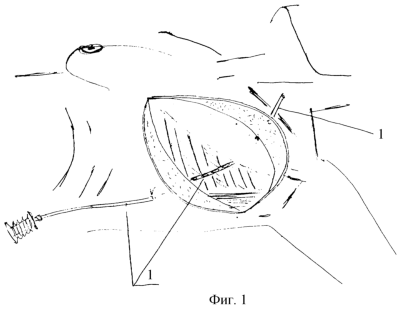 Недостатком данного способа является плохая адаптация, смещаемость кожно-фасциального лоскута, образование полости между ним и дном раны, неадекватный отток раневого отделяемого из-за образования сгустков в просвете дренажной трубки, что может в дальнейшем приводить к скоплению раневого экссудата в ране, флотации лоскута, нагноению раны и длительной лимфорее.