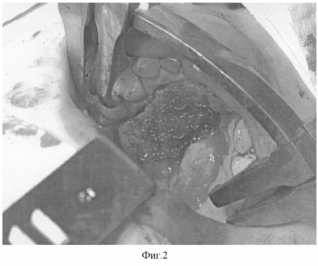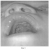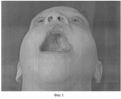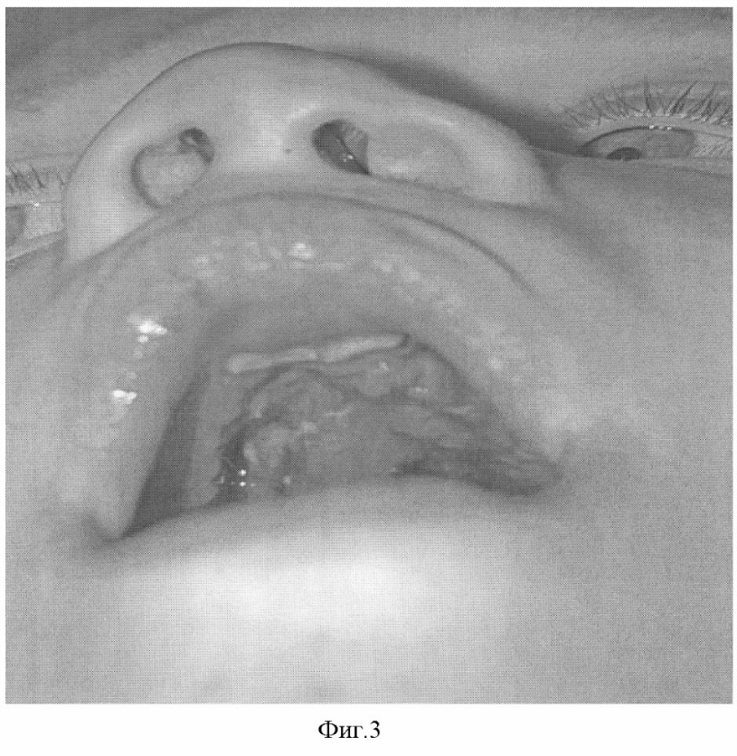 Пример. Больной Д., 5,5 лет, обратился в клинику по поводу послеоперационного дефекта среднего и переднего отдела твердого неба. Ранее оперирован по поводу врожденной полной правосторонней расщелины твердого и мягкого неба, дважды – по поводу послеоперационного дефекта твердого неба (фиг.1). Под эндотрахеальным наркозом выкроены трапециевидные слизисто-надкостничные лоскуты по обе стороны дефекта, которые мобилизованы, ротированы в сторону носовой полости, нижний лоскут деэпителизирован, на раневую поверхность верхнего лоскута (фиг.2) и деэпителизированную поверхность нижнего установлены сетчатые имплантаты с размерами ячейки от 4×4 мм, изготовленные в соответствии с их конфигурацией из никелид-титановой нити, толщиной 60 мкм, верхним рядом узловых швов имплантаты фиксированы между собой, нижним – мягкие ткани, дополнительная фиксация осуществлена йодоформными полосками и съемной защитной пластинкой. Послеоперационное течение гладкое, швы сняты спустя 10 суток. Заживление ран – первичное (фиг.3). Рекомендовано наблюдение у ортодонта и лечение у логопеда. При осмотре через 6 месяцев отмечены хорошие анатомические и функциональные результаты.