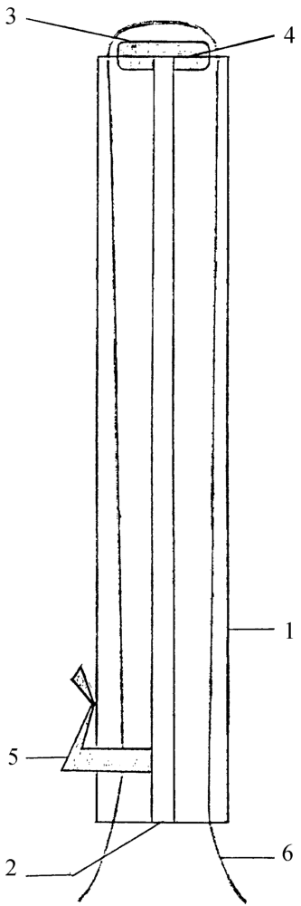 Устройство состоит из пяти частей, одной из которых является стальная трубка-чехол 1, длина которой 360 мм, внешний диаметр 10 мм, толщина стенок 1,5 мм. На внутренней поверхности трубки-чехла имеются два паза глубиной 0,5 мм, расположенных по всей длине трубки диаметрально противоположно, предназначенные для введения по длине трубки-чехла разделительной пластины 2 и ее фиксации. Разделительная пластина длиной 270 мм, шириной 8 мм, толщиной 2 мм, имеет на конце ролик 3, фиксированный болтом 4 длиной 10 мм, диаметром 1 мм. Диаметр ролика 7 мм. Для фиксации разделительной пластины используется зажим 5, выполненный в виде изогнутой пластинки шириной 5 мм, имеющей короткое плечо 20 мм, припаянное к концу трубки-чехла, и длинное плечо 30 мм, изогнутое под углом 30 градусов. Для препаровки тканей используется марлевая турунда 6 – полоска из отрезка марли шириной 112 мм и длиной от 80 до 100 мм, сложенная по длине в 4 раза наружными краями внутрь.