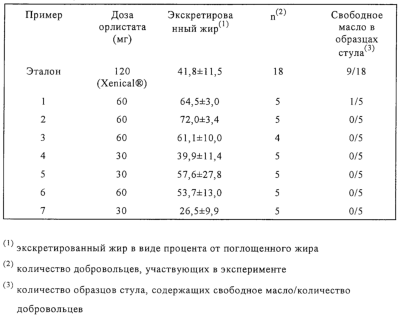 AG, Neobee M-5, фирма Stepan, Captex 355, фирма Abitec) и 120 мг полиэтиленгликоль(1000)сукцината витамина Е (TPGS, фирма Eastman Chemicals) вносили в стеклянный сосуд и смешивали путем нагревания/перемешивания при 45°С. Затем в полученной прозрачной жидкости растворяли 30 г орлистата и перемешивали до гомогенного состояния. 200 мг тонкоизмельченных шипучих таблеток витамина С добавляли при перемешивании, охлаждали до комнатной температуры (25°С), при этом происходило затвердевание смеси. Полученной таким образом композицией заполняли гидроксипропилметилцеллюлозные капсулы.