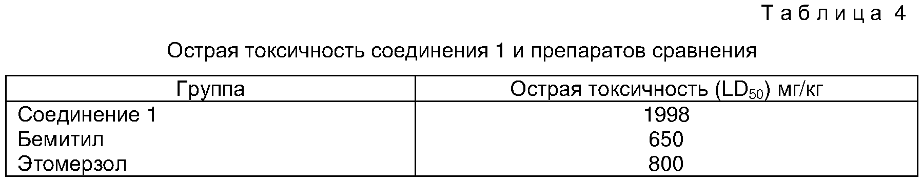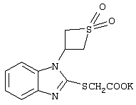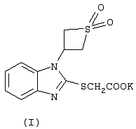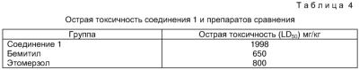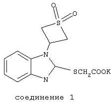 Предлагаемое изобретение относится к медицине и фармакологии и может быть использовано для получения веществ, обладающих актопротекторной активностью. Технический результат – расширение арсенала биологически активных веществ, в том числе повышающих физическую работоспособность в осложненных условиях, устойчивость к ледяной воде. Сущность изобретения: калиевая соль 2-[1-(1,1-диоксотиетанил–3)бензимидазолил-2-тио]уксусной кислоты (соединение 1) формулы в качестве вещества, повышающего физическую работоспособность в условиях плавания в ледяной воде. В качестве препаратов сравнения использовались производные бензимидазола – бемитил и этомерзол, обладающие психостимулирующим, антигипоксическим, иммуностимулирующим и актопротекторным действием. (Машковский М.Д. Лекарственные средства. М.: Медицина, 2000, Т.1, с.122; Бобков Ю.Г., Виноградов В.М., Катков В.Ф. и др. Фармакологическая коррекция утомления. М.: Медицина, 1984, 207 с.; Бойко С.С., Бобков Ю.Г., Незнамов Г.Г., Серебрякова Т.В. Фармакокинетика и клинический эффект бемитила после однократного применения. Фармакол. и токсикол. 1986, №5, с.17-19; Удовиченко В.И., Кожевникова Л.М., Лосев А.С., Бобков Ю.Г. Лечебная эффективность нового антигипоксанта этомерзола при экстремальном геморрагическом шоке. Патол. физиология и эксперим. терапия. 1991, №2, с.34-35). Соединение 1 синтезируют по методике, описанной в патенте на изобретение №2115652 от 20 июля 1998 г. по заявке №96121472 от 1 ноября 1996 г. Актопротекторную активность соединения 1 и препаратов сравнения изучали на неинбредных мышах-самцах массой 18-22 г, полученных из питомника лабораторных животных “Столбовая”, г. Москва. В качестве оценки актопротекторной активности использовали модель предельного плавания мышей при различной температуре воды. Соединение 1 и препараты сравнения вводили внутрибрюшинно однократно за 1 час до проведения эксперимента. В каждой группе использовали по 8 животных. Пример 1. Влияние соединения 1 и препаратов сравнения на физическую работоспособность мышей в условиях нормотермии оценивали по тесту предельного времени плавания в воде с температурой 27±0,5°С (Рылова М.Л., 1994; Бобков Ю.Г. и соавт., 1984) и грузом весом 5% от массы животного. Таким образом, актопротекторы этомерзол и бемитил при однократном введении в эффективных дозах (40 и 50 мг/кг) увеличивают длительность плавания мышей на 34,68 и 48,39% соответственно (табл. 1). Соединение 1 в дозах 50 и 100 мг/кг повышает уровень физической работоспособности на 6,95 и 12,89%. Пример 2. Для оценки фригопротекторной активности соединения 1 и препаратов сравнения и влияния на работоспособность использована “жесткая” модель острой иммерсионной гипотермии беспородных мышей (плавание в ледяной воде +4°С без груза) (Чудаков А.Ю. и соавт., 1990). Результаты приведены в табл.2. Установлено, что длительность плавания мышей после введения бемитила сокращается на 16,63% (Р<0,05). В жесткой модели гипотермии этомерзол практически не влияет на длительность плавания мышей. Соединение 1 статистически значимо увеличивает работоспособность мышей в условиях плавания в ледяной воде в дозе 100 мг/кг (121,33% по отношению к контролю; Р <0,05). Пример 3. Тепловая устойчивость животных оценивалась по тесту предельного плавания в воде с температурой 40±0,5°С и грузом весом 5% от массы животного (Новиков B.C. и соавт., 1998). Результаты представлены в табл.3