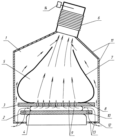 При включении нагревательного элемента 4 атмосферный воздух по отверстиям 13 поступает в корпус 1, проходит через нижнюю перфорированную пластину 2, частично освобождается от влаги и образует побочный поток, движущийся вдоль внутренних стенок 11 корпуса 1 по направлению к дыхательной трубке 6. В то же время воздух через нагревательный элемент 4 поступает в каналы 9 верхней пластины 3, частицы воздуха, прогреваясь, устремляются в сосуд 5, на выходе которого получают наибольшее ускорение. Мощный, прогретый, обезвоженный и частично разреженный основной поток подтягивает более влажный побочный поток, приобретая тем самым смягчающий эффект, а полученная воздушная масса поступает в дыхательную трубку 6. Температурный режим, от которого зависит плотность и интенсивность воздушной смеси, задается реле 14 терморегулятора по параметрам физиологических особенностей пациента в диапазоне 60-90 градусов С в дневное время и 40-70 градусов С ночью при подключении дыхательной трубки через маску к пациенту. Вдыхаемая воздушная смесь устремляется в легкие пациента, активно втягивая в себя на протяжении всего своего пути злокачественные отложения, оказывает отхаркивающее действие, восстанавливающее проходимость дыхательных путей, и способствует расширению сосудов.