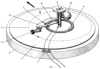 1 – контакты питания; 2 – пластина; 3 – плавучее основание (плот); 4 – двигатель с роликом; 5 – траектория движения ролика по пластине; 6 – планка; 7 – контактная система; 8 – прерыватель; 9 – ось вращения, 10 – шар в рамке.