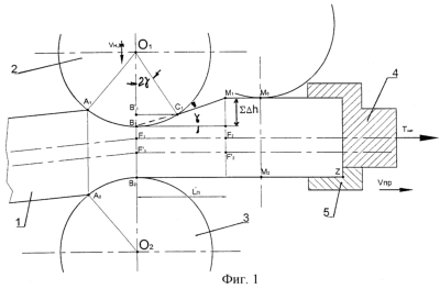 Так как ось заготовки F1-F2 заневолена на выходе из валков в натяжном устройстве 4, верхний валок 2, осуществляющий обжатие, производит одновременно прокатку совместно с нижним валком 3 участка полосы A1 B1 В2 А2 и пластический изгиб раската относительно образующей нижнего рабочего валка (точка В2).