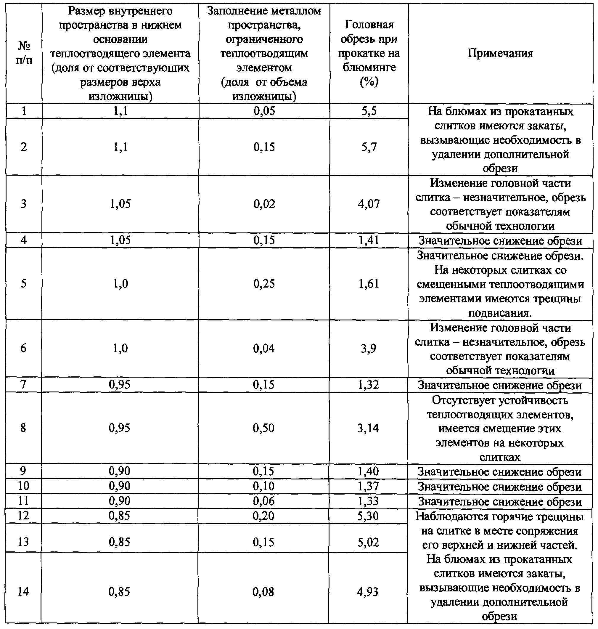 Анализ результатов, приведенных в таблице, показывает, что наивысший экономический эффект при применении изобретения достигается при заполнении металлом пространства, ограниченного теплоотводящим элементом в пределах 0,05-0,5 объема пространства, заполняемого металлом в изложнице, и при размере внутреннего пространства в нижнем основании теплоотводящего элемента от 0,9 до 1,05 размера внутреннего пространства верха изложницы.