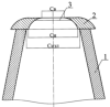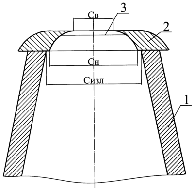 Превышение размеров внутреннего пространства теплоотводящего элемента в нижнем основании больше 1,05 размеров рабочего пространства верха изложницы также ограничено максимальной величиной “ступеньки” на слитке. При превышении размерами нижнего основания теплоотводящего элемента соответствующих размеров рабочего пространства верха изложницы размер “ступеньки” определяется в зависимости от массы нижней части слитка, периметра поперечного сечения в плоскости сопряжения изложницы и отводящего тепло элемента и предела прочности конкретной марки стали при температуре кристаллизации. При выплавке слитка с такой “ступенькой” происходит равномерное распределение напряжений по периметру образовавшейся корки слитка. Минимизируется или полностью отсутствует торможение усадке и слиток не проседает. Сводится к минимуму вероятность горячих трещин по телу слитка при кристаллизации и дальнейшей прокатке.