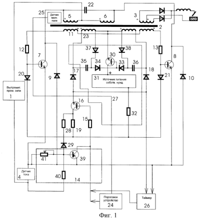 Компаратор 14 может быть реализован на базе транзистора 39 и резисторов 40, 41. Пороговое устройство 24 и таймер 26 могут быть собраны по общеизвестным схемам, например, на операционных усилителях. Датчик тока 4 может представлять из себя шунт. Датчик 25 магнитного поля может быть выполнен в виде катушки, намотанной на незамкнутом магнитопроводе с разрезом, причем незамкнутая часть должна быть обращена в сторону силового трансформатора.
