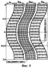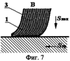 Перемещаясь по обработанной кругом 2 поверхности заготовки, подвижный круг 3 в зоне контакта производит срезание микронеровностей в направлении, перпендикулярном рискам-царапинам, прорезанным кругом 2 (см. фиг.8); при обратном ходе, перемещаясь по обработанной кругом 4. Благодаря наклону среднего круга и натягу, осуществляемого Sпоп, основное силовое воздействие на обрабатываемую поверхность осуществляется частями лепестков, находящимися на периферии и имеющими наибольший прогиб (см. фиг.6 и 7). Направление прогиба лепестков меняется в зависимости от углового положения круга. Если зона контакта среднего круга с заготовкой расположена справа от нормали (см. фиг.6), то направление прогиба – вправо, при этом лепестки работают левым абразивным торцом, если зона контакта – слева от нормали, то направление прогиба – влево, а лепестки работают правым абразивным торцом (см. фиг.7).