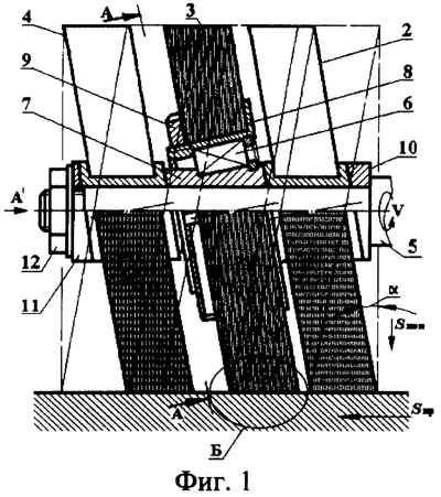 Круг 3, подвижно смонтированный с помощью подшипникового узла 6 на валу 5, обкатывается по обрабатываемой поверхности и благодаря его наклону в зоне контакта с заготовкой совершает возвратно-поступательные осциллирующие колебательные движения вдоль продольной оси вращения.