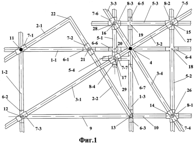 Другой конец штанги 5-3 установлен с возможностью относительного перемещения в горизонтальном звене крестообразного ортогонального ползуна 8-3, который образует пару вращения с шарнирным ползуном 7-6, в котором с возможностью перемещения установлено верхнее звено 3-3 крестообразного рычага. В вертикальном звене крестообразного ортогонального ползуна 8-3 установлен с возможностью относительного перемещения один конец штанги 5-1, которая скреплена с ползуном 6-6, который имеет возможность перемещения вдоль горизонтальной направляющей 1-1. Другой конец штанги 5-1 установлен с возможностью относительного перемещения в вертикальном звене крестообразного ортогонального ползуна 8-4, который образует пару вращения с шарнирным ползуном 7-7, а в горизонтальном звене крестообразного ортогонального ползуна 8-4 установлен с возможностью относительного перемещения конец штанги 5-4, которая скреплена с ползуном 6-7, имеющим возможность перемещения вдоль правой вертикальной направляющей 1-3.
