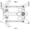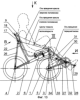 Управление велосипедом в варианте, показанном на фиг.8-12, осуществляется рычагами 47, 48 с рулевыми рукоятками 49, 50. Для выполнения, например, правого поворота велосипедист правой рукой нажимает на правую рулевую рукоятку 49 в направлении вправо и перемещает тягу 53 назад, что вызывает поворот вправо передней вилки 5 с передним колесом 1. Аналогично выполняется левый поворот, только для этого велосипедист нажимает левой рукой на левую рукоятку 50.