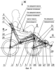 Управление велосипедом в варианте, показанном на фиг.13-17, осуществляется рычагами 57, 58 с рулевыми рукоятками 59, 60. Для выполнения, например, правого поворота велосипедист правой рукой перемещает назад правую рулевую рукоятку 59. При этом второе плечо 61 рычага управления через звено 63 упирается в ось 64 на раме 6, что вызывает смещение кресла 9 и поворот вправо передней вилки 5 с передним колесом 1. Аналогично выполняется левый поворот, только для этого велосипедист перемещает левой рукой назад левую рукоятку 60.