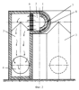 Футерованная цилиндрическая камера (обозначена поз.1) через распределительную камеру 2 сообщается с реакционными камерами 3, выходящими через отверстия для вывода технологического газа 4, каждая в свои индивидуальные котельные секции 5. Непосредственно в отверстии для подвода технологического газа в реакционную камеру размещена огнеупорная решетка 6, перед которой на выходе цилиндрической камеры установлены фурмы 7 для подачи восстановительного газа от раздаточного коллектора 8. Распределительная камера 2 и обе реакционные камеры 3 вместе образуют реакционный объем.