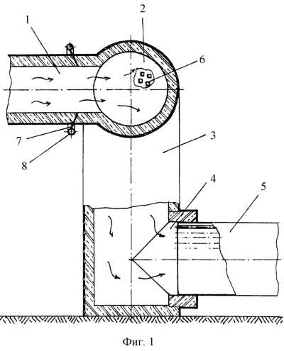 Исходный сернистый технологический газ, разогретый в цилиндрической камере 1 за счет сжигания газообразного топлива до температур восстановления диоксида серы (1150-1250°С), поступает в распределительную камеру 2 (направление течения газа показано стрелками), причем на выходе из цилиндрической камеры 1 в технологический газ от коллектора 8 через фурмы 7 вводят восстановительный природный газ. Струи восстановительного природного газа, равномерно распределяемые в поперечном сечении цилиндрической камеры, пронизываются потоком нагретого технологического сернистого газа, что обеспечивает их перемешивание в плоскости выходного отверстия цилиндрической камеры. В распределительной камере поток разделяется на две части, каждая из которых поступает в свою реакционную камеру. Окончательная гомогенизация газовой смеси и выравнивание температуры осуществляется на решетках 6, т.е. уже внутри реакционных камер 3 (фиг.1). Охлажденные в котельных секциях 5 обе части потока технологического газа объединяются после котельных секций реактора-генератора (не показано).