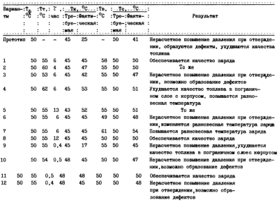 Из данных таблицы видно, что изготовление заряда по предлагаемым режимам способа (варианты 1, 2, 8, 11) обеспечивает получение качественного заряда. Отклонение параметров ведения процесса за пределы, предусмотренные способом, приводит к ухудшению качества заряда по монолитности (варианты 3, 10, 12), к нерасчетному повышению давления при отверждении (варианты 3, 6, 9, 10, 12), к повышению равновесной температуры заряда (варианты 4, 5, 7) и к ухудшению качества топлива в пограничном слое с корпусом (варианты 4, 5, 9).