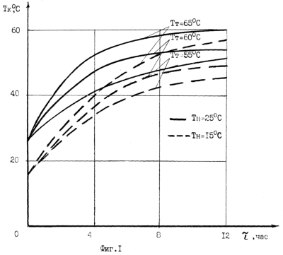 Продолжительность прогрева пресс-формы перед формованием ( ) зависит от начальной температуры пресс-формы (Тн) перед прогревом от температуры, до которой необходимо прогреть пресс-форму до начала заполнения (Тк), от температуры теплоносителя (Тт) при прогреве и определяется из графической зависимости, приведенной на фиг.1, 2. Зависимости строятся отдельно для каждого типа заряда по данным, полученным расчетным путем, исходя из геометрических размеров, теплофизических свойств пресс-формы, топлива и коэффициента теплоотдачи от теплоносителя к пресс-форме.