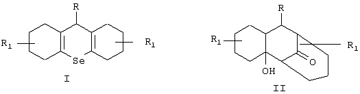 Изобретение относится к способу получения селенопиранов, проявляющих биологическую активность, а также к медицине, фармакологии, пищевой и косметической промышленности, и может быть использовано в производстве пищевых добавок и лекарственных препаратов широкого спектра действия. Известен способ получения структурных аналогов – 9-замещенных симм-октагидротиоксантенов из Цель изобретения – разработка метода синтеза замещенных селенопиранов. Поставленная цель достигается способом получения 9-R-симм- гидроселеноксантенов общей формулы I, заключающимся в том, что охлажденный расплав соединения общей формулы II (где R – фенил, о-фторфенил, п-метоксифенил, п-фенилацетат, алкил, R1 – алкил, оксиалкил) растворяют в смеси уксусной кислоты с уксусным ангидридом в условиях кислотного катализа с селеноводородом и выделяют конечный продукт. Выход целевого продукта – 75-95%, длительность процесса – 3-4 ч. Пример 1. Способ получения 9-фенил-октагидроселеноксантена. К 500 г 4-фенил-2,3-тетраметилен/3.3.1/бициклононон-9-ола-2 добавляют 7 г гидроксида натрия, нагревают в инертной атмосфере при 200°С в течение 5-10 мин, остужают расплав до 100-110°С, растворяют в 1000-1500 мл горячей смеси уксусная кислота:уксусный ангидрид (в соотношении 4:1-5:1). Горячий раствор при постоянном перемешивании остужают до выпадения мелкокристаллического осадка, в суспензию барботируют азот в течение 30 мин. Затем насыщают 30 мин селеноводородом, вносят в течение 1 ч 100 мл концентрированной соляной кислоты и продолжают насыщать селеноводородом до выпадения желтого кристаллического осадка. Осадок отфильтровывают, промывают уксусной кислотой и этанолом. При необходимости продукт перекристаллизовывают из ацетона или спирта. Выход целевого продукта составляет 495 г. Температура плавления – 95-96°С. Содержание селена в препарате составляет 22.7-24%. Чистота препарата – не менее 98%. Содержание примесей в виде пирана – не более 1.5%. Пример 2. Способ получения 9-п-метоксифенил-октагидроселеноксантена. К 500 г 4-п-метоксифенил-2,3-тетраметилен/3.3.1/бициклононон-9-ола-2 добавляют 6.6 г гидроксида натрия, нагревают в инертной атмосфере при 220°С в течение 5-10 мин, растворяют расплав в 1000-1500 мл горячей смеси уксусная кислота:уксусный ангидрид (в соотношении 4:1-5:1). Горячий раствор при постоянном перемешивании остужают до выпадения мелкокристаллического осадка, в суспензию барботируют азот в течение 40 мин. Затем насыщают 30 мин селеноводородом и вносят в течение 1 ч 100 мл концентрированной соляной кислоты и продолжают насыщать селеноводородом до выпадения кристаллического осадка. Осадок отфильтровывают, промывают уксусной кислотой и этанолом. При необходимости продукт перекристаллизовывают из ацетона или спирта. Выход целевого продукта составляет 420 г. Температура плавления – 83°С. Содержание селена в препарате составляет 21.1-22%. Чистота препарата – не менее 98%. Содержание примесей в виде пирана – не более 1.7%.