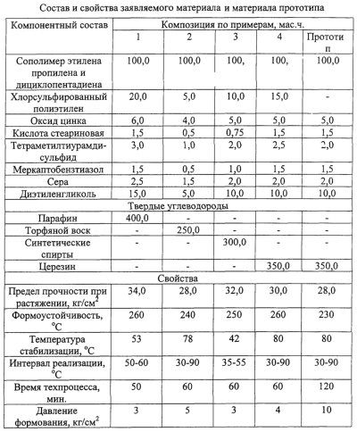 1. Композиция для теплоаккумулирующего материала, включающая сополимер на основе этилена, пропилена и дициклопентадиена, фазопереходное вещество – твердые углеводороды, оксид цинка, стеариновую кислоту, тетраметилтиурамдисульфид, серу, меркаптобензтиазол и диэтиленгликоль, отличающаяся тем, что она дополнительно содержит хлорсульфированный полиэтилен при следующем соотношении компонентов, мас.ч.: Сополимер этилена, пропилена и дициклопентадиена 100,0 Хлорсульфированный полиэтилен 5,0-20,0 Кислота стеариновая 0,5-1,5 Оксид цинка 4,0-6,0 Тетраметилтиурамдисульфид 1,0-3,0 Сера 1,5-2,5 Меркаптобензтиазол 0,5-1,5 Диэтиленгликоль 5,0-15,0 Твердые углеводороды 250,0-400,0 2. Композиция по п.1, отличающаяся тем, что в качестве твердых углеводородов используют парафин, церезин, воск, спирты синтетические первичные высшие жирные.