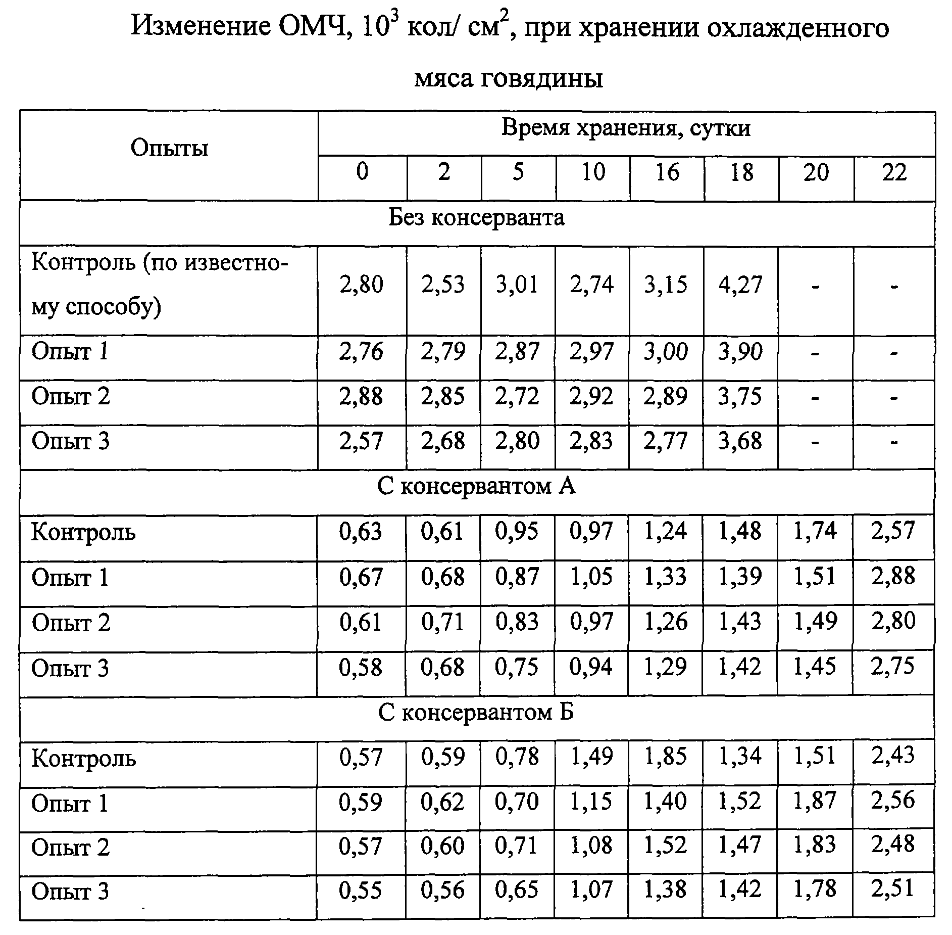 Изобретение относится к методам исследования продуктов животного происхождения и может быть использовано в мясоперерабатывающей отрасли пищевой промышленности. Качество и стойкость мяса к изменению свойств при хранении связаны с количественным содержанием микроорганизмов на его поверхности как до, так и в процессе хранения мяса. Микробная порча – основная причина порчи мяса и ухудшения его качества. Известен способ исследования качества мяса животных при хранении, его свежести и пригодности к переработке и потреблению по изменению микробной обсемененности образцов мяса, взятых из подготовленной для хранения мясной туши или отруба [1]. Согласно способу микробную обсемененность определяют по количеству колоний микроорганизмов, которые вырастают на соответствующей питательной среде, например на мясопептонном агаре, при посеве субстрата и культивировании при температуре, благоприятной для размножения основных возбудителей порчи мяса – сапрофитной микрофлоры (гнилостных бактерий, бактерий группы кишечной палочки, сальмонелл, спор плесневых грибов, дрожжей, кокковых бактерий и др.). Известный способ исследования качества мяса при хранении имеет существенные недостатки. Для анализа требуется образец мяса, отобранный из туши или отруба массой не менее 200 г. При этом необходимо отбирать пробу из нескольких мест туш (не менее трех). В процессе хранения и особенно при исследованиях с целью определения сроков хранения мяса и эффективности консервантов требуется многократный отбор образцов и их анализ. Причем согласно общим требованиям к точности эксперимента необходимо проводить не менее 2-3 анализов. Таким образом, для проведения экспериментов при хранении мяса необходимо значительное количество мяса для анализов – до 2-10 кг, что удорожает и вместе с тем усложняет проведение исследований. Кроме того, воспроизводимость опытов с натуральным мясом недостаточно высокая и не обеспечивает необходимой точности из-за неоднородности исследуемых образцов мяса. Это происходит вследствие того, что пробы каждый раз отбирают с разных мест туши (отруба), так как каждую последующую пробу, в принципе, невозможно отобрать с места предыдущего отбора. Поэтому и обсемененность образцов не будет отражать действительного состояния качества мяса. Технический результат заявляемого изобретения заключается в повышении точности и воспроизводимости, упрощении и удешевлении проведения исследования качества мяса животных при хранении. Это достигается тем, что исследование качества мяса животных при хранении по изменению микробной обсемененности, включающее определение микробов посевом из пробы на питательную среду, проводят на модельном образце мяса, выполненном из губчатого материала, например поролона, пропитанной водным настоем исследуемого мяса, а посев микробов на питательную среду ведут из пробы, полученной промывкой образца модели мяса водой или с его поверхности. Способ осуществляется следующим образом. В зависимости от цели исследования (наблюдение в процессе хранения, определение сроков хранения, изменение условий хранения, оценка действий консервантов и др.) отбирают образцы (пробы) мяса из одного или нескольких наиболее уязвимых мест для размножения микроорганизмов на туше (отруба). При этом исследуется каждый обр