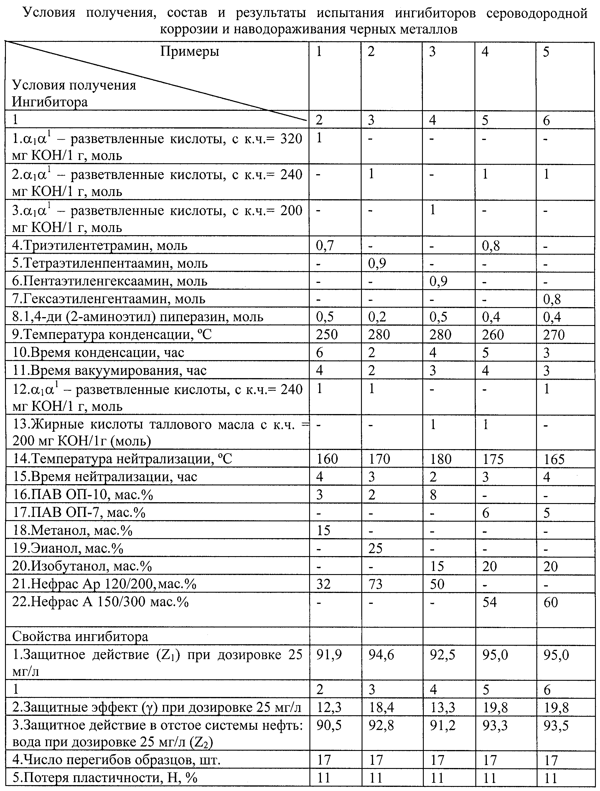 Указанный выше технический результат достигается особенностью заявляемого изобретения, заключающейся в способе получения ингибиторов сероводородной коррозии и наводораживания металлов путем взаимодействия разветвленных алифатических монокарбоновых кислот с полиэтиленполиаминами и 1,4-ди(2-аминоэтил)пиперазином, которая заключается в том, что в качестве кислот используют , 1-разветвленные монокарбоновые кислоты фракции С10-С20, а процесс ведут при температуре 250-280° С в течение 2-6 часов при мольном соотношении кислота фракции С10-С20 : полиэтиленполиамины : 1,2-ди(2-аминоэтил)пиперазин, равном 1:0,70-0,9:0.2-0,5, затем при вакуумировании 1-30 мм вод.ст. в течение 2-4 часов отгоняют реакционную воду и избыток полиэтиленполиаминов, реактор охлаждают до 160-180° С и при перемешивании загружают , 1-разветвленные монокарбоновые кислоты фракции С10-С20 или жирные кислоты талового масла в мольном соотношении продукт конденсации : кислота, равном 1:1, перемешивают в течение 2-4 часов, охлаждают до 40-60° С и вводят при перемешивании 2-8 мас.% поверхностно-активного вещества неионогенного типа, 10-25 мас.% насыщенного одноатомного спирта C1-C4, 32-73 мас.% композиционного ароматического растворителя, перемешивают до получения однородного раствора и охлаждают (Нефрас АР 120/200 или Нефрас А-150-300).