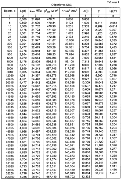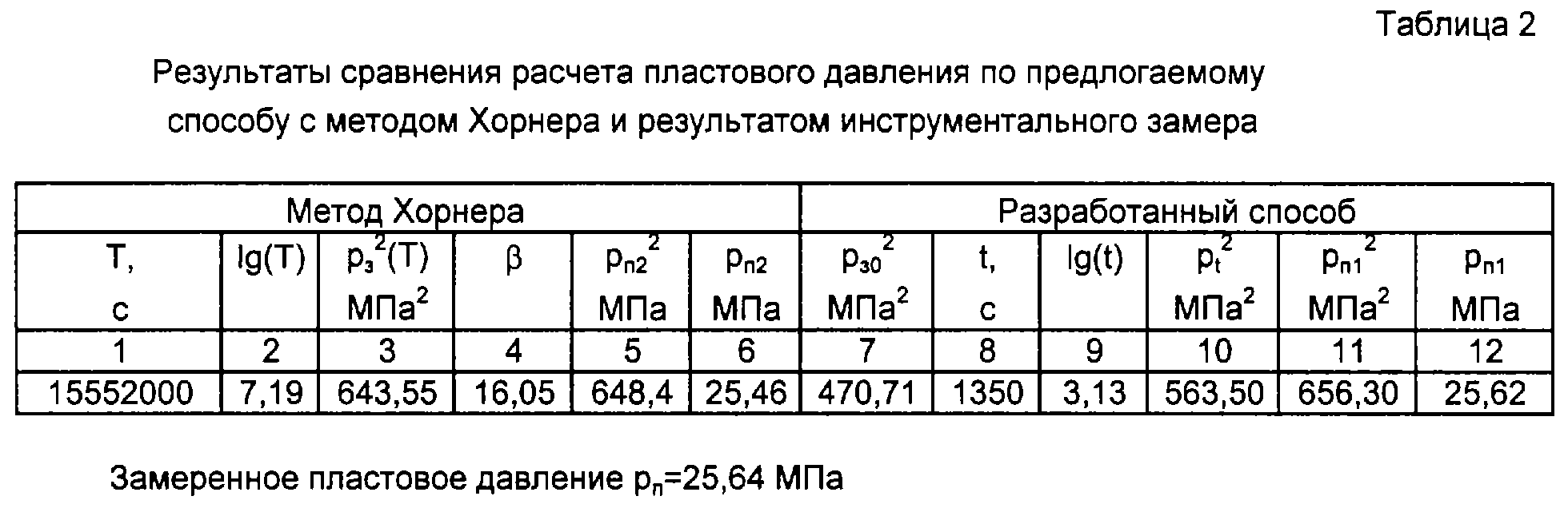 Скважина до остановки работала на стационарном эксплуатационном режиме в течение шести месяцев (Т=1555200 с). Перед остановкой на скважине было замерено забойное давление рз0=21, 696 МПа (р2з0=470,7 МПа2). После остановки скважины в течение 52250 с проводилась регистрация КВД и после полного восстановления давления через 226800 с замерено пластовое давление рп=25,64 МПа. Пластовое давление, определенное по методу Хорнера, составило рП2=25,46 МПа. Пластовое давление, определенное по заявленному способу, составило pп1=25,62 МПа.