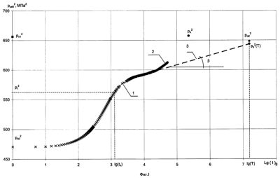 Точка p2п1 (фиг.1) является величиной квадрата пластового давления, определенного разработанным способом, точка р2п2 – величина квадрата пластового давления определенного методом Хорнера, кривая 1 условно недовосстановленная часть КВД, кривая 2 часть КВД восстановленной до пластового давления рп, линия 3 продолжение КВД по методу Хорнера при регистрации только одного прямолинейного участка КВД.