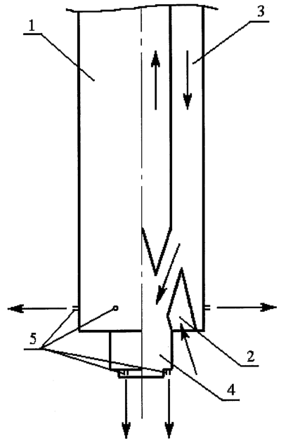 – противоположно направленные размывающий и всасываемый потоки, при этом размывающий поток, образованный струями воды из размывающих форсунок, препятствует перемещению взвешенных частиц полезного ископаемого к всасывающему патрубку, что приводит к снижению технической производительности;