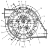Работу роторно-поршневой машины рассмотрим на примере работы пневмогидронасоса, компрессора. При вращении ротора 5 вместе с ползунами 6 и шарнирно связанными с ними поршнями 7 по часовой стрелке, между соседними поршнями 7 изменяется расстояние от максимального до минимального и наоборот, а значит, также изменяется и рабочий объем рабочих камер 8. При этом оси 11 одного из ползунов 12, шарнирно связанные с кольцами 10, расположенными с обеих сторон ротора 5, вращают их относительно кольцевых выточек 9, выполненных в корпусе 1, а ролики 13 осей 14 остальных ползунов 6, находящихся в С-образных кольцевых пазах 15, свободно изменяют расстояние между осями 14 роликов 13. Наименьшее расстояние между осями 14 соседних роликов 13 ползунов 6 достигается при минимальном рабочем объеме рабочих камер 8, а максимальное расстояние между осями 14 соседних роликов 13 – при максимальном рабочем объеме рабочих камер 8. При изменении расстояний между осями 14, ролики 13 свободно перекатываются в С-образных кольцевых пазах 15, одновременно вращаются вместе с кольцами 10. Силы инерции, возникающие при вращении ползунов 6, передаются через ролики 13 осей 14 ползунов 6 на поверхности С-образных кольцевых пазов 15. Результатирующая величина силы инерции от диаметрально расположенных ползунов 6, равная разности сил инерции, передается на кольцо 10, а затем, на стенки кольцевых выточек 9 корпуса 1. В результате такого взаимодействия роликов 13 и осей 14 ползунов 6, колец 10 с С-образным пазом 15 поверхности кольцевых выточек 9, выполненных в корпусе 1, осуществляется передача результатирующей силы инерции, как разности сил инерции диаметрально расположенных ползунов 6, т.е. передача этой силы на более развитые цилиндрические поверхности выточек 9, что существенно снижает контактные напряжения, а значит, их износ. Таким образом, благодаря смещению центра вращения ротора 5 относительно центра тороидальной рабочей поверхности 2 корпуса 1, в кольцевых выточках 9 которого с обеих сторон ротора 5 установлены кольца 10, шарнирно связанные с осями 11 одного из ползунов 12, а ролики 13 осей 14 остальных ползунов 6 расположены в С-образных кольцевых пазах 15, выполненных в кольцах 10, как было указано выше, осуществляется изменение рабочих объемом рабочих камер 8 от минимального до максимального и наоборот. При дальнейшем вращении ротора 5 создается разрежение и в результате перепада давления атмосферного вне насоса и внутреннего пониженного давления воздух (жидкость) поступает через впускное окно 3 и заполняет рабочий объем рабочей камеры 8. По мере вращения ротора 5 рабочий объем рабочей камеры 8, достигнув своего максимума, в самом нижнем положении рабочей камеры 8 на уровне вертикали, начинает уменьшаться, несколько сжимаясь, воздух (жидкость) поступает в зону выпускного окна 4. При дальнейшем вращении ротора 5 происходит накапливание воздуха (жидкости) в зоне выпускного окна 4, где давление повышается и величина его достигает величины давления, равного давлению сопротивления на выходе из выпускного окна 4. Происходит нагнетание воздуха (жидкости) в рабочую магистраль с минимальными затратами энергии при высокой надежности и долговечности, а значит, высоком моторесурсе работы роторно-поршневой машины.