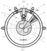 Соосно с корпусом 1 двигателя установлена газораспределительная камера 22, размещенная в корпусе 23. В камеру 22 подается топливно-воздушная смесь, состоящая из воздуха, очищенного воздухоочистителем 24, и перемешанная с топливом в карбюраторе 25. Смесь дополнительно перемешивается крыльчаткой 26, установленной на валу 5, и по пути, указанному стрелкой В, подается в рабочие полости 8 и 9 цилиндра через золотниковый клапан 27, снабженный запорной втулкой 28. Во втулке 28 выполнены отверстия 29, с помощью которых осуществляется сообщение камеры 22 через отверстия в корпусе 23 и отверстия 30 вала 5 с рабочими полостями 8 или 9. Запорная втулка 28 имеет привод отвала 5.
