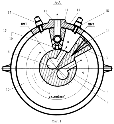 Двигатель работает по принципу четырехтактного двигателя двойного действия, так как в цилиндре одновременно реализуются два рабочих цикла: один в рабочей полости 8, другой – в рабочей полости 9.