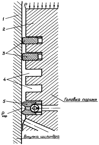 Втулка цилиндра 1 сопряжена с головкой поршня 2, содержащей два уплотнительных кольца 3, две резервные канавки 4 и одно маслосъемное кольцо 5 с уплотнительными функциями. Кольцевое уплотнение нагружено среднецикловым давлением Рi со стороны рабочей камеры и давлением Ркар со стороны картера двигателя.