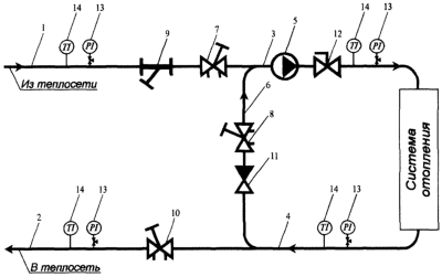 Сетевая вода из подающей магистрали 1 тепловой сети проходит через фильтр, 9 предназначенный для защиты балансировочных клапанов 7, 8, 10 насоса 5, поступая на балансировочный клапан 7, предназначенный для ограничения расхода теплоносителя из подающей магистрали до расчетного значения и выполняющий функцию регулятора расхода. Проходя через узел смешения 6, где установлен балансировочный клапан 8, который обеспечивает расчетный коэффициент смешения и ограничивает подачу теплоносителя из обратного трубопровода 4 до расчетного значения, теплоноситель поступает на циркуляционный насос 5, а затем в систему отопления. Для предотвращения попадания прямого теплоносителя из подающей магистрали 1 в обратную магистраль 2 тепловой сети через смесительную магистраль 6 на ней установлен обратный клапан 11. Теплоноситель из системы отопления, проходя узел смешения 6, поступает в обратную магистраль 2 тепловой сети, где дополнительно может быть установлен балансировочный клапан 10, который предотвращает опрокидывание циркуляции в системе отопления. Балансировочный клапан 10 настроен на гашение избыточного напора, создаваемого насосом, и пропуск расчетного расхода, т. е. выполняет функцию регулятора давления.